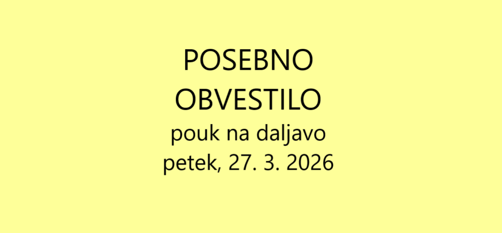 POSEBNO OBVESTILO PETEK, 27. 3. 2026, BO POUK POTEKAL NA DALJAVO. Spoštovani dijaki, študenti, starši, skrbniki, delodajalci. Obveščamo vas, da bo jutrišnji pouk , zaradi izrednih razmer na SZ Slovenije, potekal na daljavo. To velja tudi za vse dijake, ki