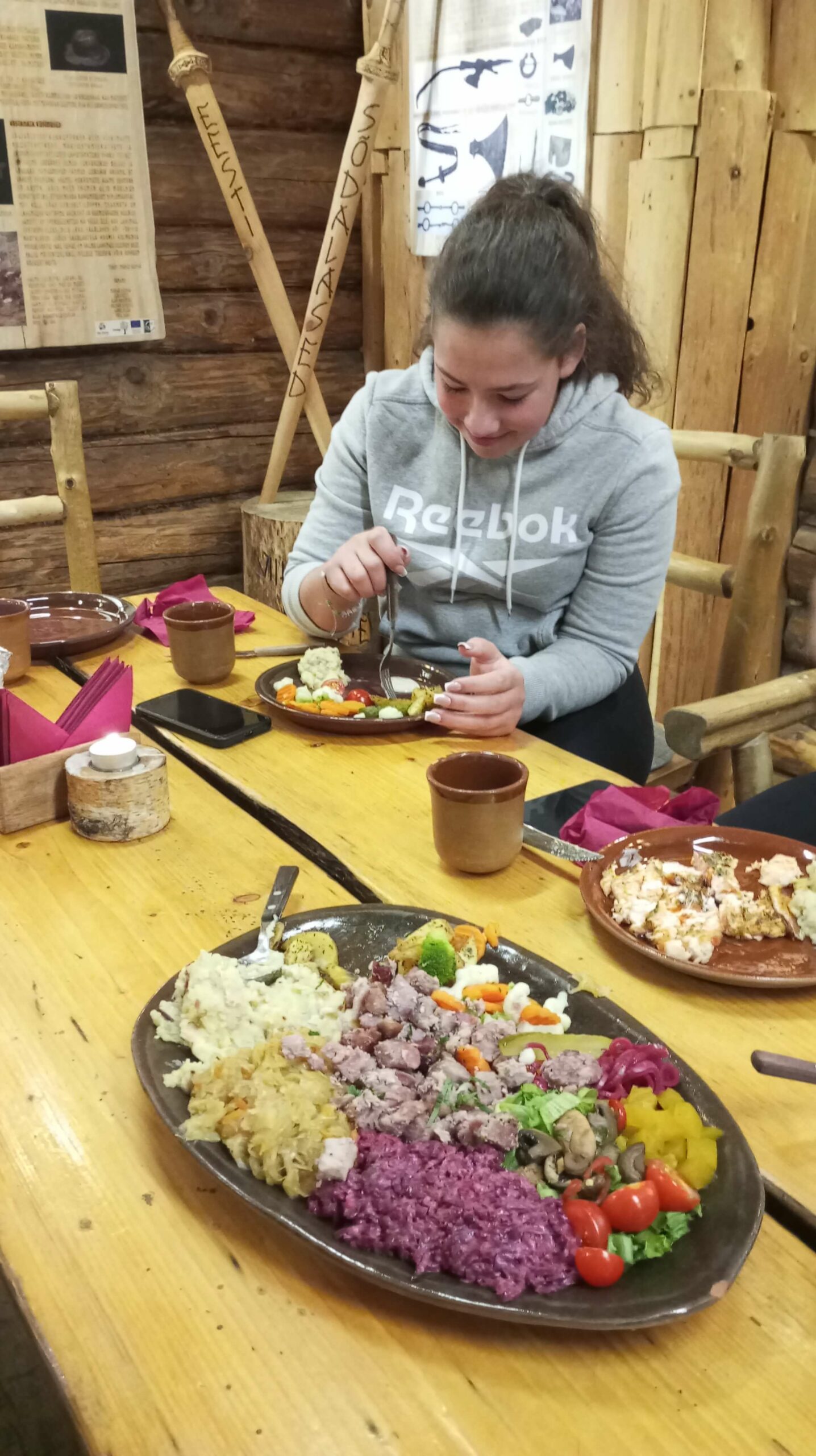 Skupaj smo se z avtobusom odpeljali v vikinško vas, kjer nas je čakalo pozno kosilo. V leseni koči, opremljeni v vikinškem slogu, nas je pričakala prava pojedina. Poleg okusnih glavnih jedi smo si privoščile še sladice – čokoladno tortico z jogurtovim prelivom, mehke palačinke z marmelado in sladoledom ter kavico z mlekom. Kuharji so se res potrudili, vzdušje pa je bilo čudovito.