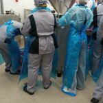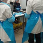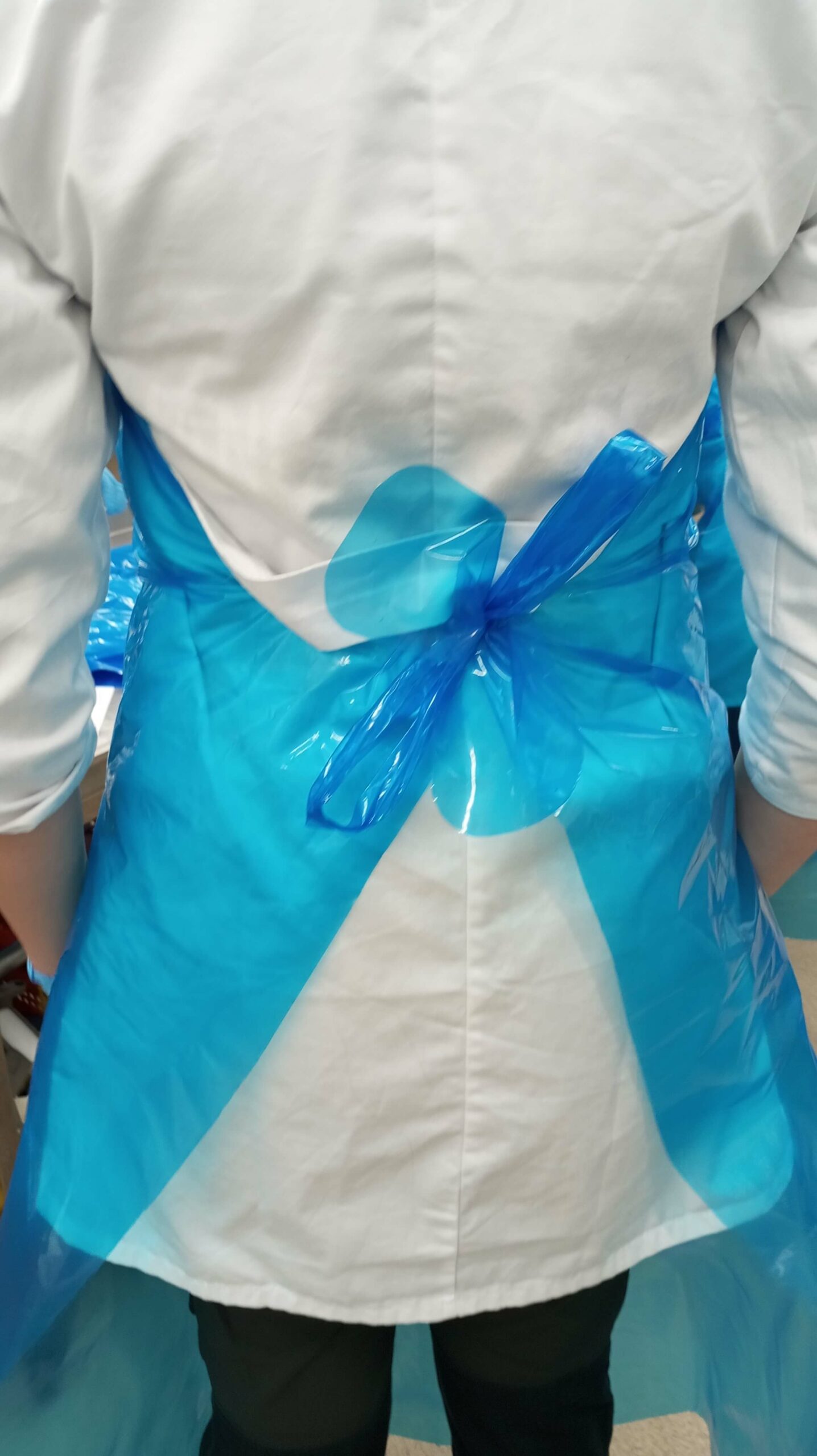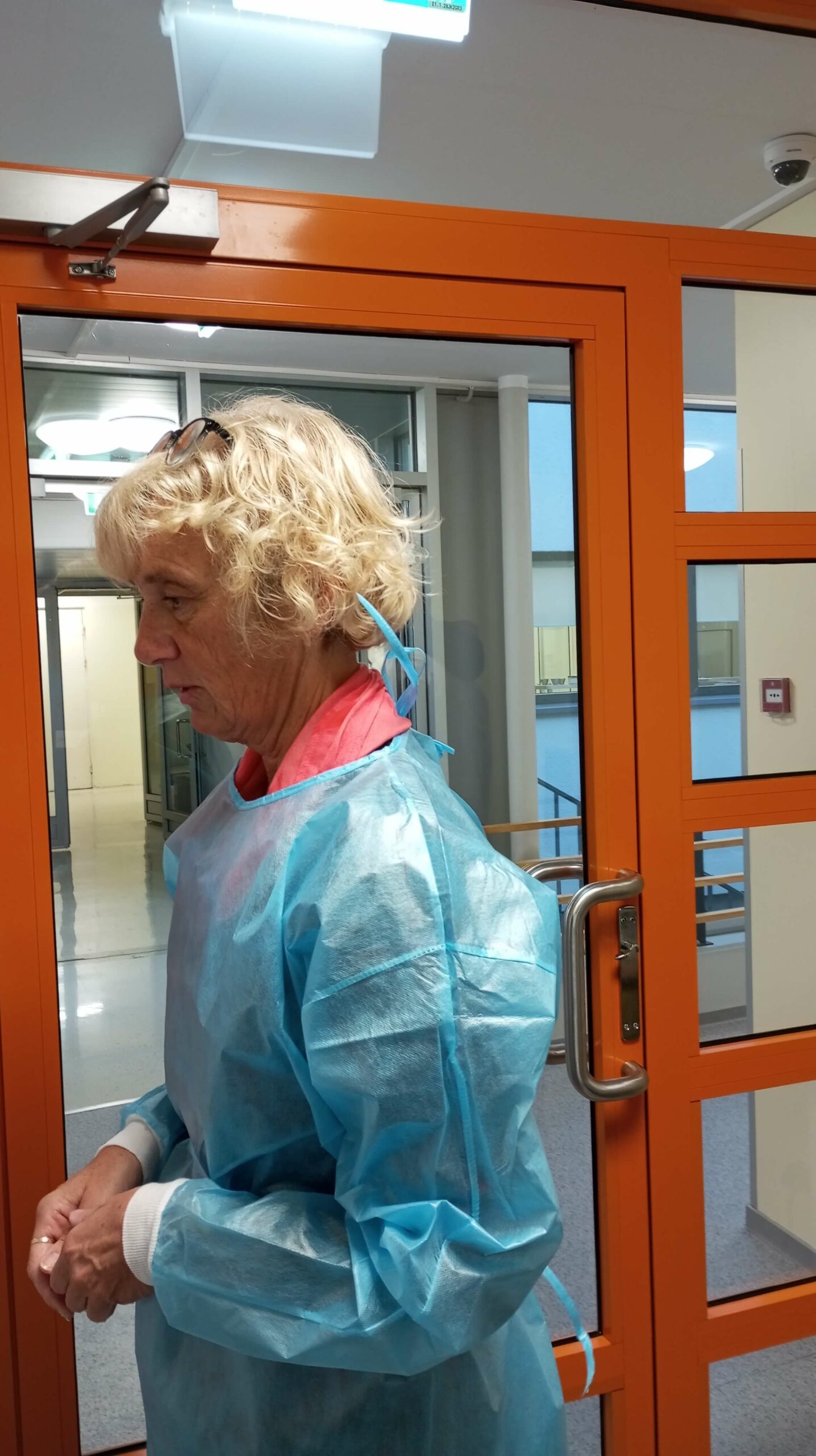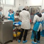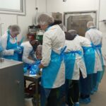 Avtobus nas je odpeljal v šolo, kjer nas je pri vhodu že čakala naša mentorica Eva. »Praktis, praktis!« je vzkliknila in nas spodbudila, da se odpravimo v prostor za pripravo na delo. Tam smo si oblekle zaščitna oblačila, pri čemer je bil poudarek na zaščiti rok, dlani in prstov.