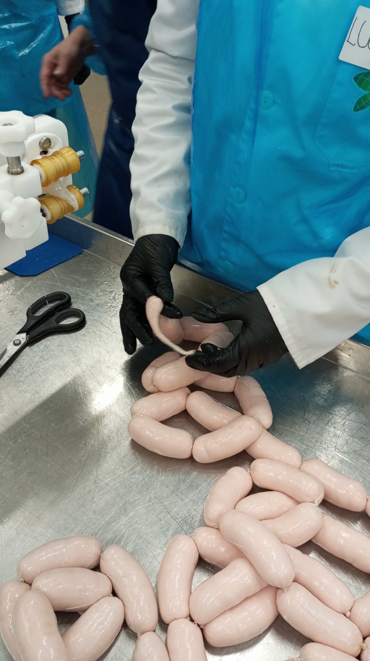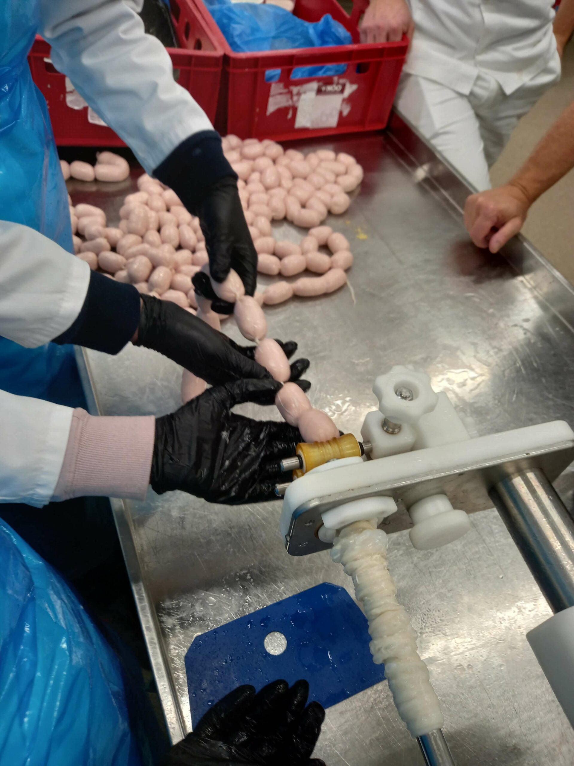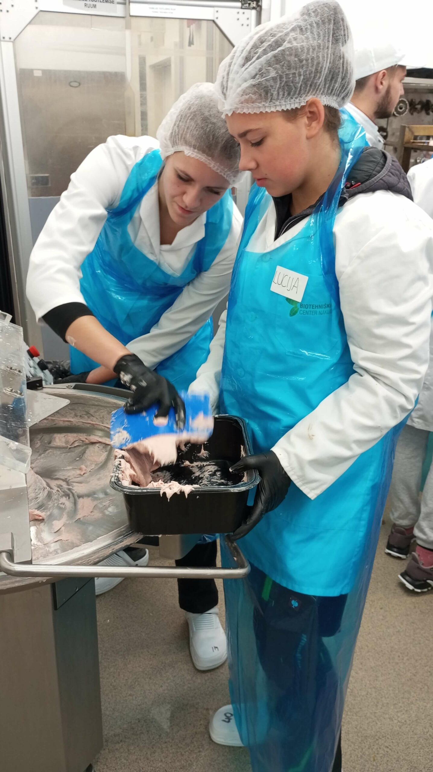 Po prvi degustaciji je sledilo vakumsko pakiranje mletega mesa in dimljenih piščančjih perutničk. Stroje smo dobro spoznale in z vakumiranjem nismo imele nobenih težav. Po krajšem odmoru smo se z mentorico Evo lotile še priprave dveh vrst hrenovk – iz svinjskega in govejega mesa. Na podlagi recepta ter že pridobljenega znanja o izračunu sestavin in pravilni uporabi mešalnih strojev so izpod naših rok nastajale debele, kratke, zanimive hrenovke. Naložile smo jih na posebna stojala in jih odpeljale v dimljenje.