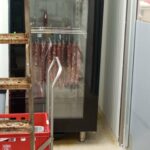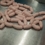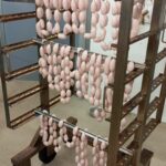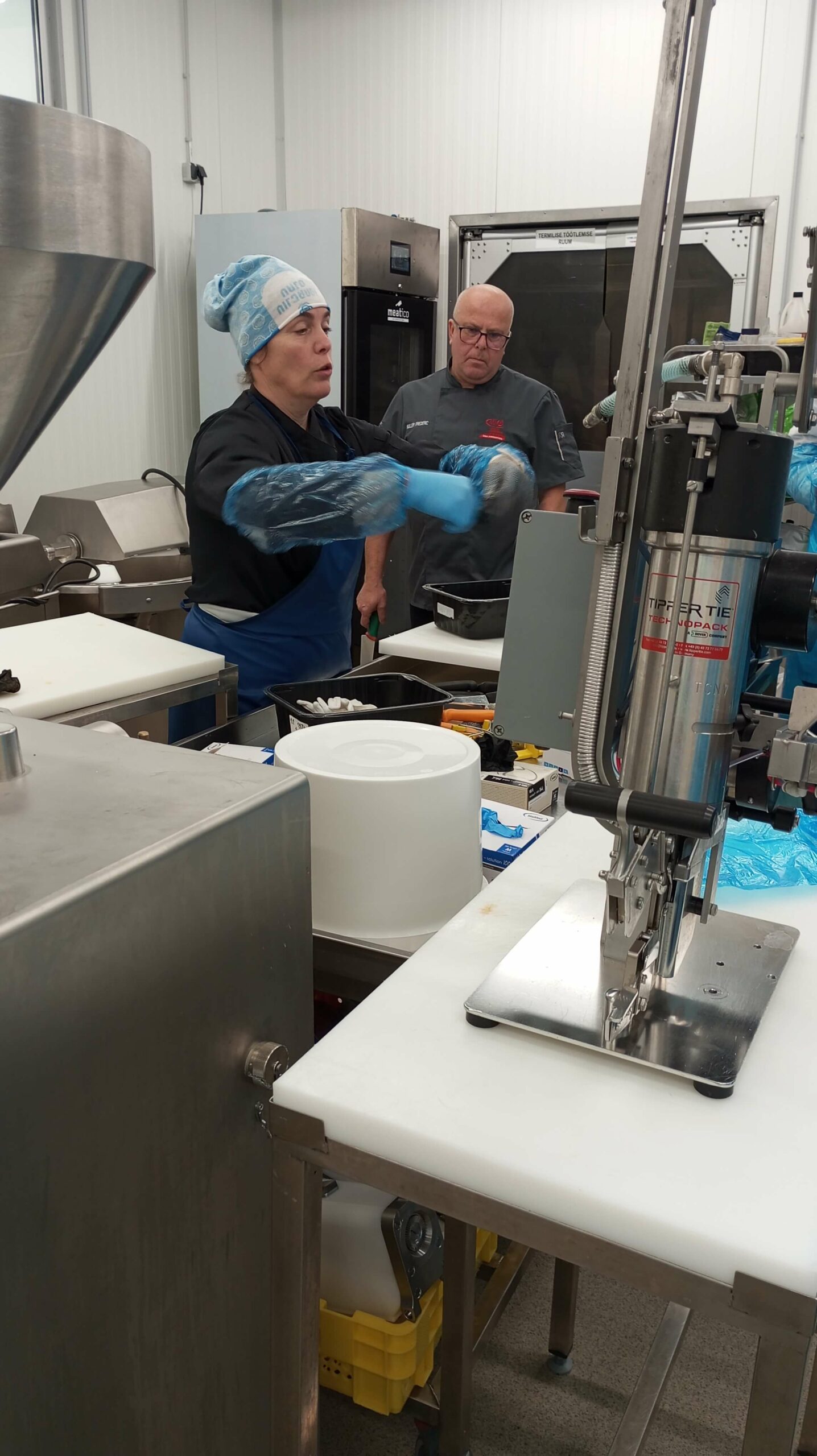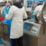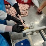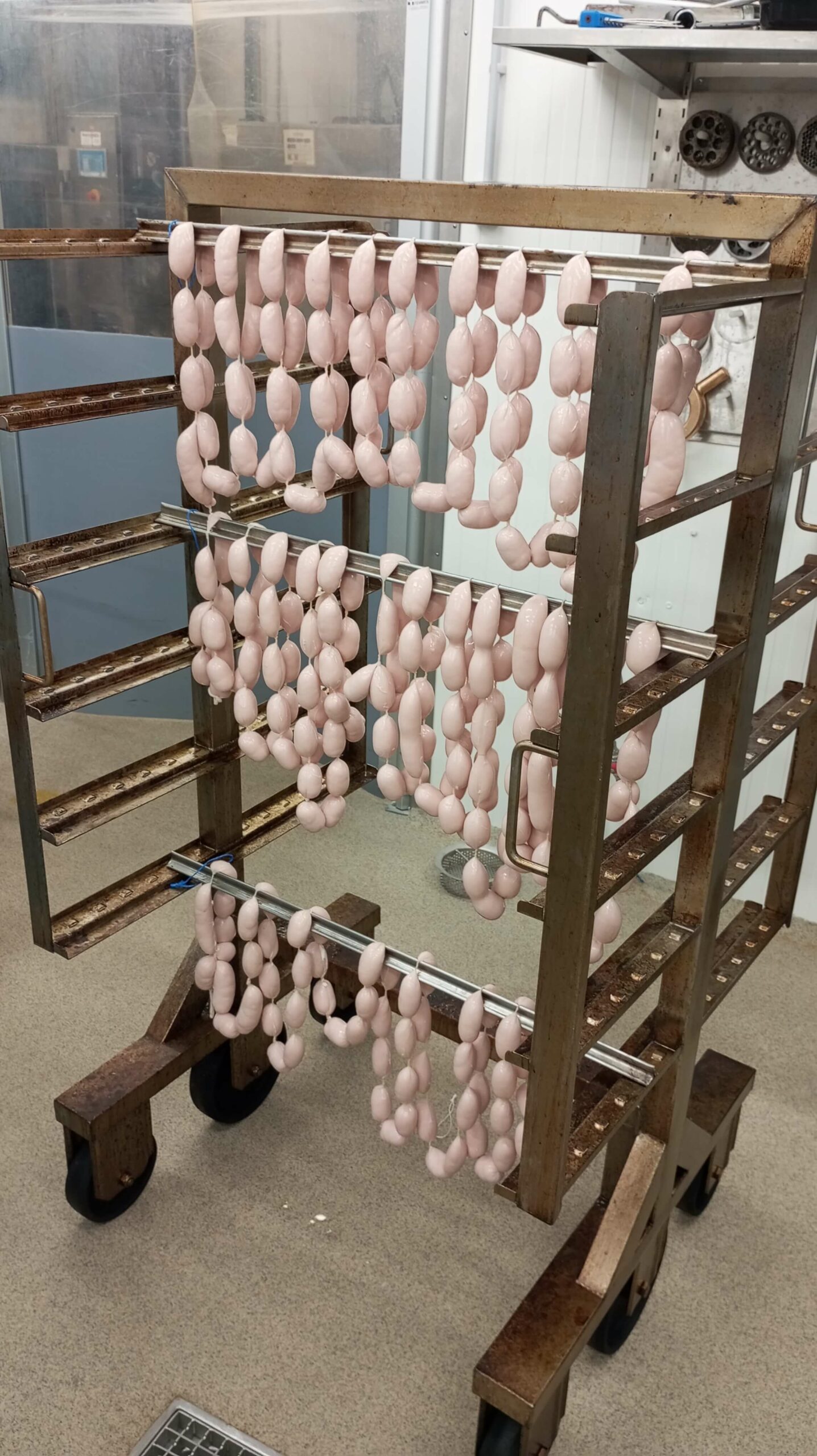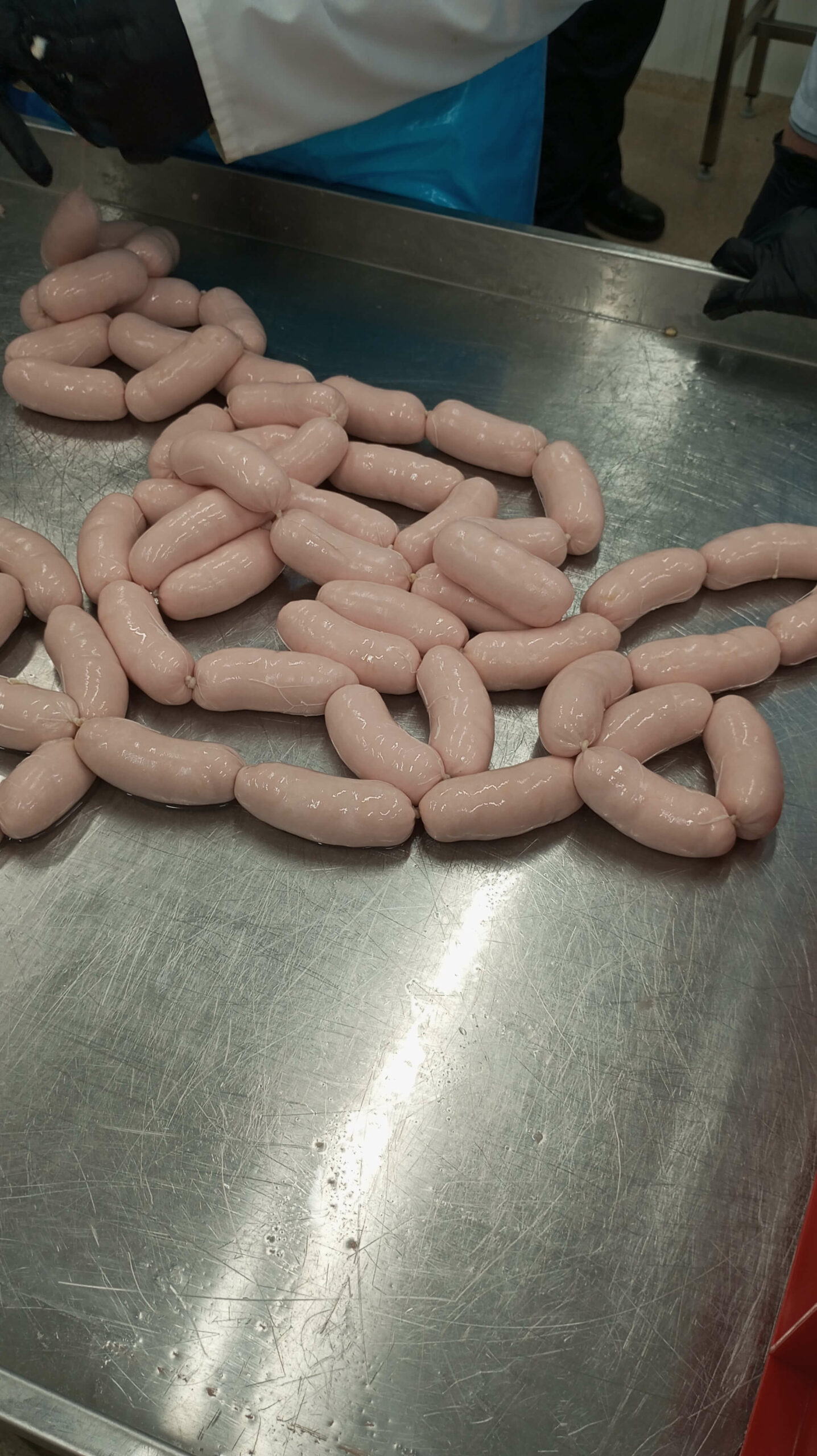 Po prvi degustaciji je sledilo vakumsko pakiranje mletega mesa in dimljenih piščančjih perutničk. Stroje smo dobro spoznale in z vakumiranjem nismo imele nobenih težav. Po krajšem odmoru smo se z mentorico Evo lotile še priprave dveh vrst hrenovk – iz svinjskega in govejega mesa. Na podlagi recepta ter že pridobljenega znanja o izračunu sestavin in pravilni uporabi mešalnih strojev so izpod naših rok nastajale debele, kratke, zanimive hrenovke. Naložile smo jih na posebna stojala in jih odpeljale v dimljenje.