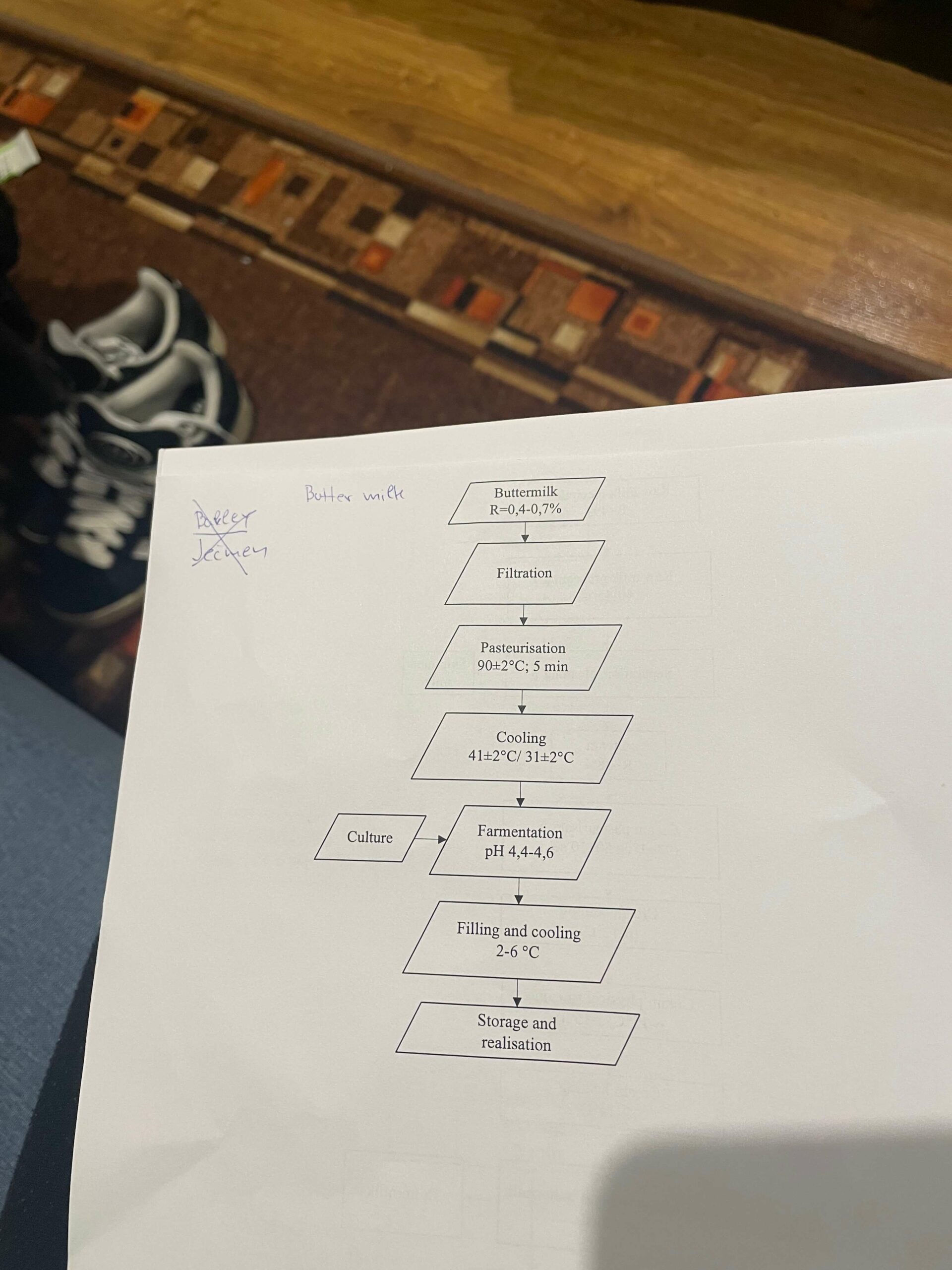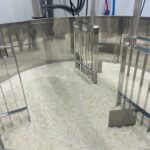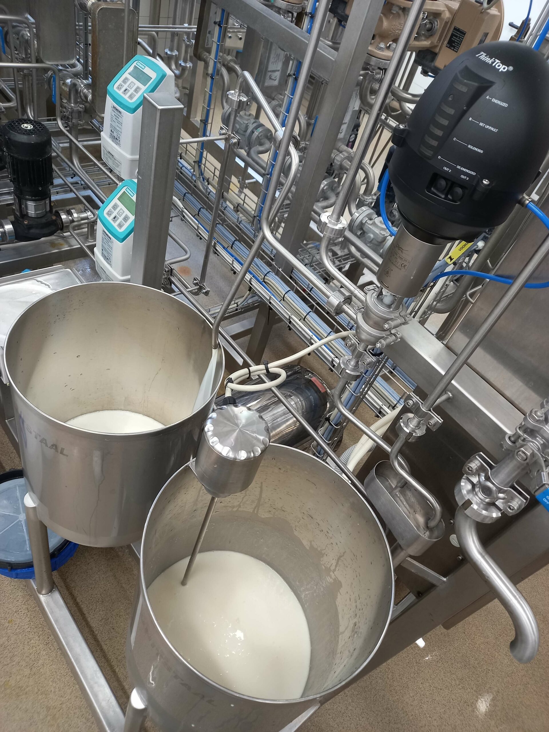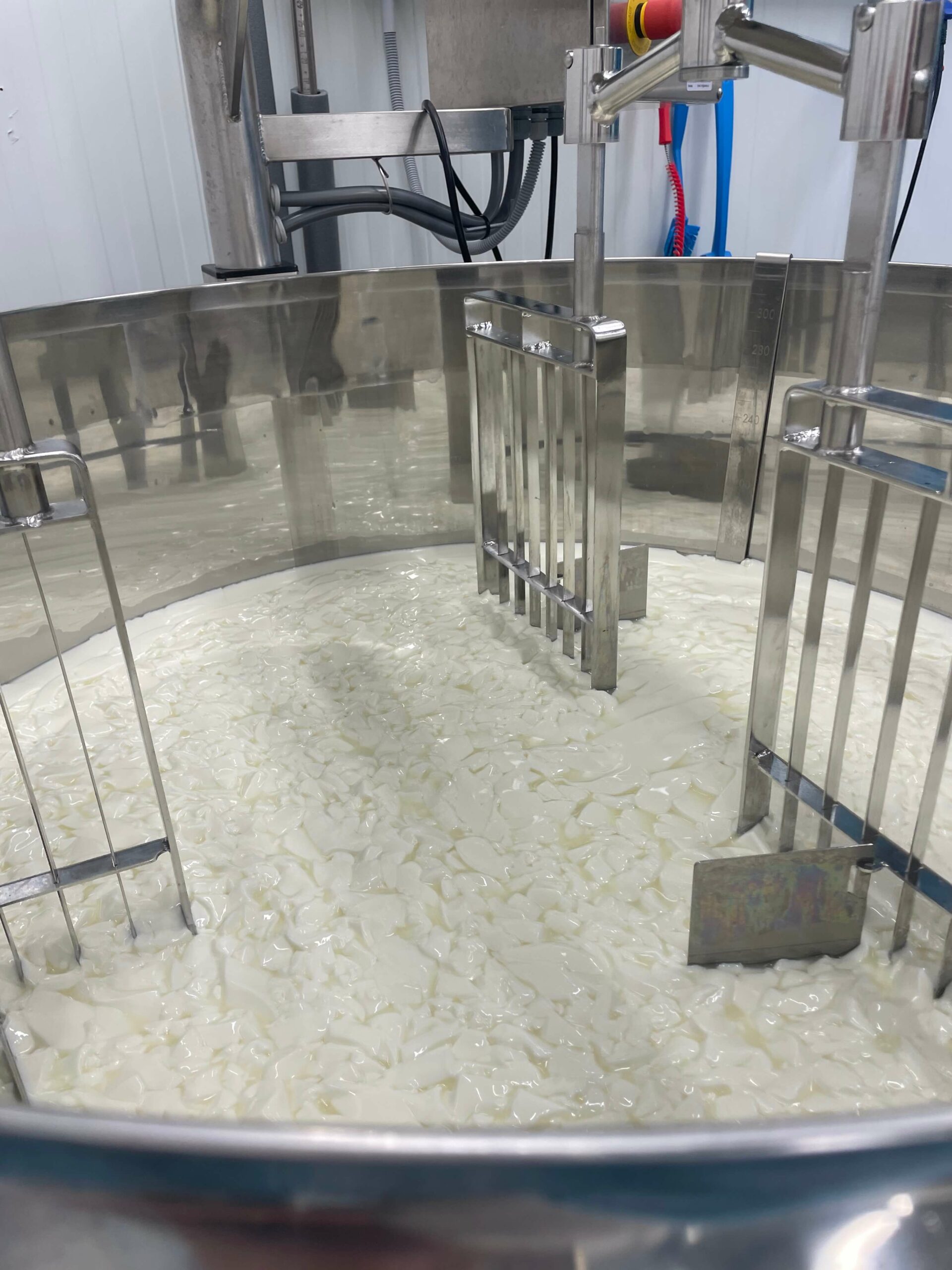 V drugem koraku smo mleko pasterizirali pri približno 64 °C, nato pa ga ohladili na okoli 32 °C. Dodali smo mlečnokislinsko kulturo, ki poskrbi za začetno fermentacijo in razvoj značilnega okusa, ter sirilo (encim), ki povzroči koagulacijo – strjevanje mleka.