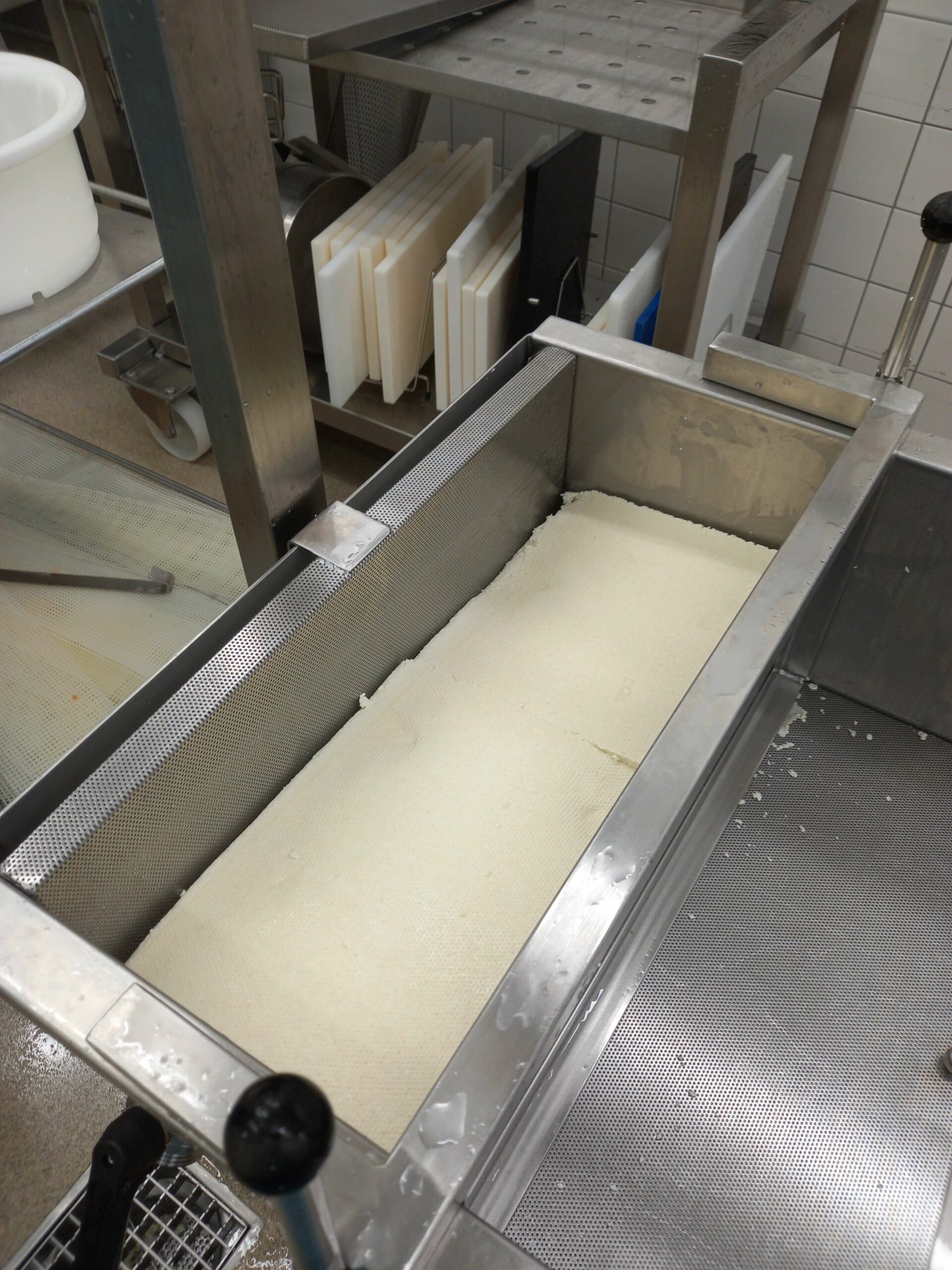 Sledilo je ločevanje sirotke od skute. Skuta se je med mešanjem in rahlim segrevanjem vedno bolj čvrsto povezovala in postopoma izgubljala sirotko. Nato smo maso razrezali na večje kose, jo cheddarirali – to pomeni, da se koščki skute zlagajo drug na drugega, da se dodatno odcedijo in razvijejo svojo strukturo. Po določenem času smo maso narezali, posolili in naložili v kalupe, kjer je pod pritiskom iztekla še preostala sirotka. Po določenem času smo sire v kalupih obrnili, da se enakomerno stisnejo, nato pa so bili pripravljeni za zorenje, ki običajno traja več tednov do mesecev.