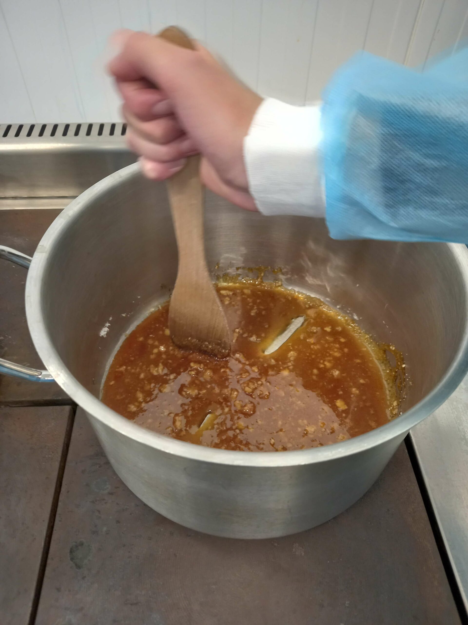 Popoldne smo se ponovno vrnili v mlekarsko delavnico, kjer smo po navodilih mentorja Edgarja pripravljali karamelo s smetano. Natančno smo merili količine sladkorja, segrevali ga na primerno temperaturo ter mu dodali maslo in sladko smetano – rezultat je bila odlična, kremna karamela, ki smo jo za spomin shranili v steklene kozarčke in jo odnesli domov v Slovenijo.