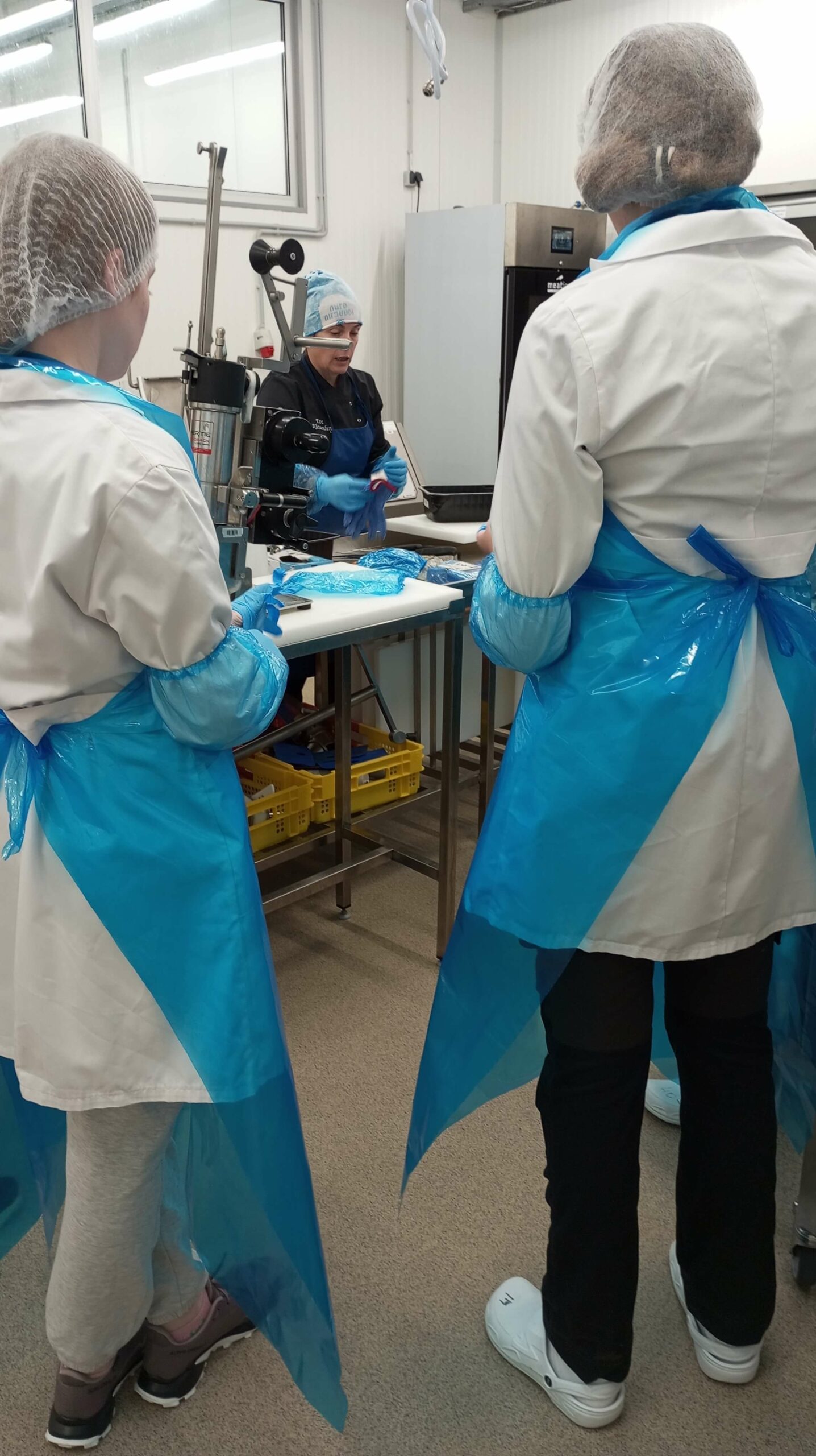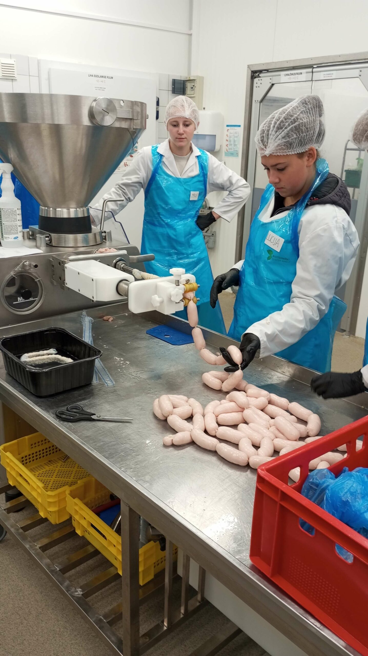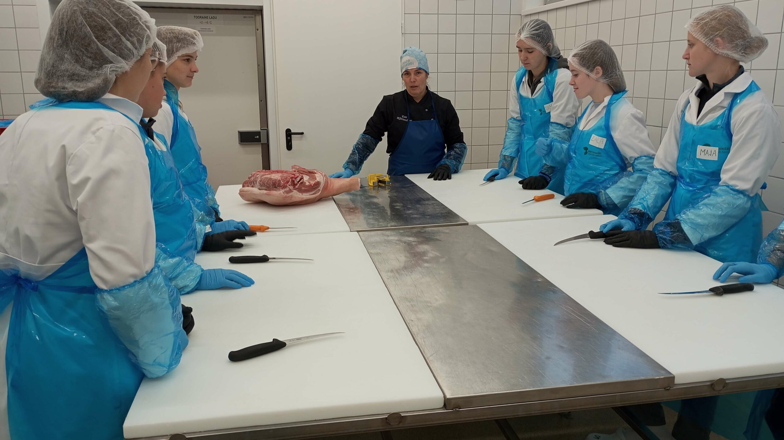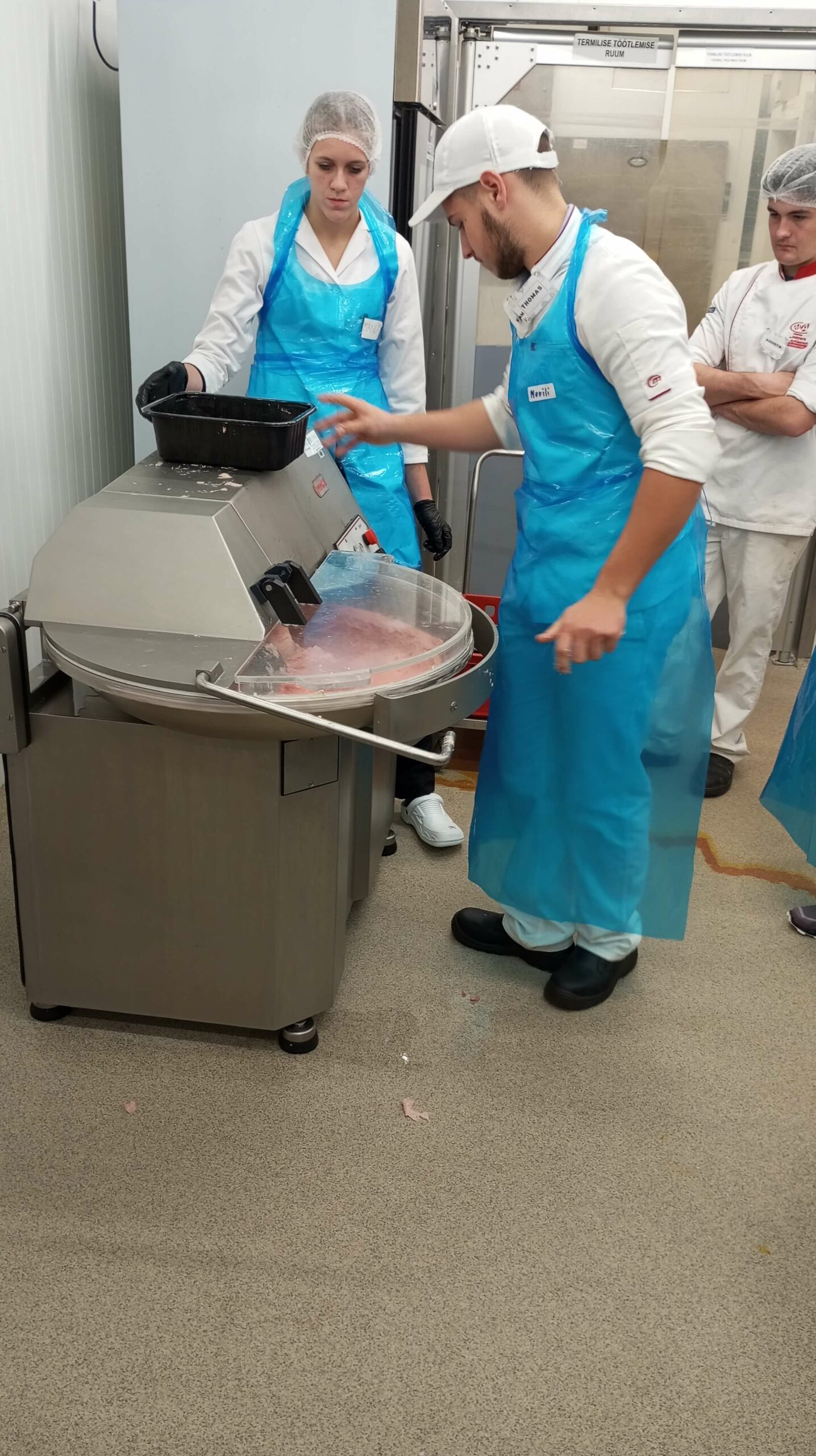 Danes je imela Anja rojstni dan, zato smo jo presenetile z Napoleonovo torto, ki so nam jo pripravili naši prijatelji iz Estonije. Bila je izjemno okusna! Po kosilu smo se znova oblekle v zaščitno opremo in v mesarski delavnici čakale na nova navodila mentorice Eve. Razdelila nas je v dve skupini, vsaka pa je dobila 17 kilogramov mesa.