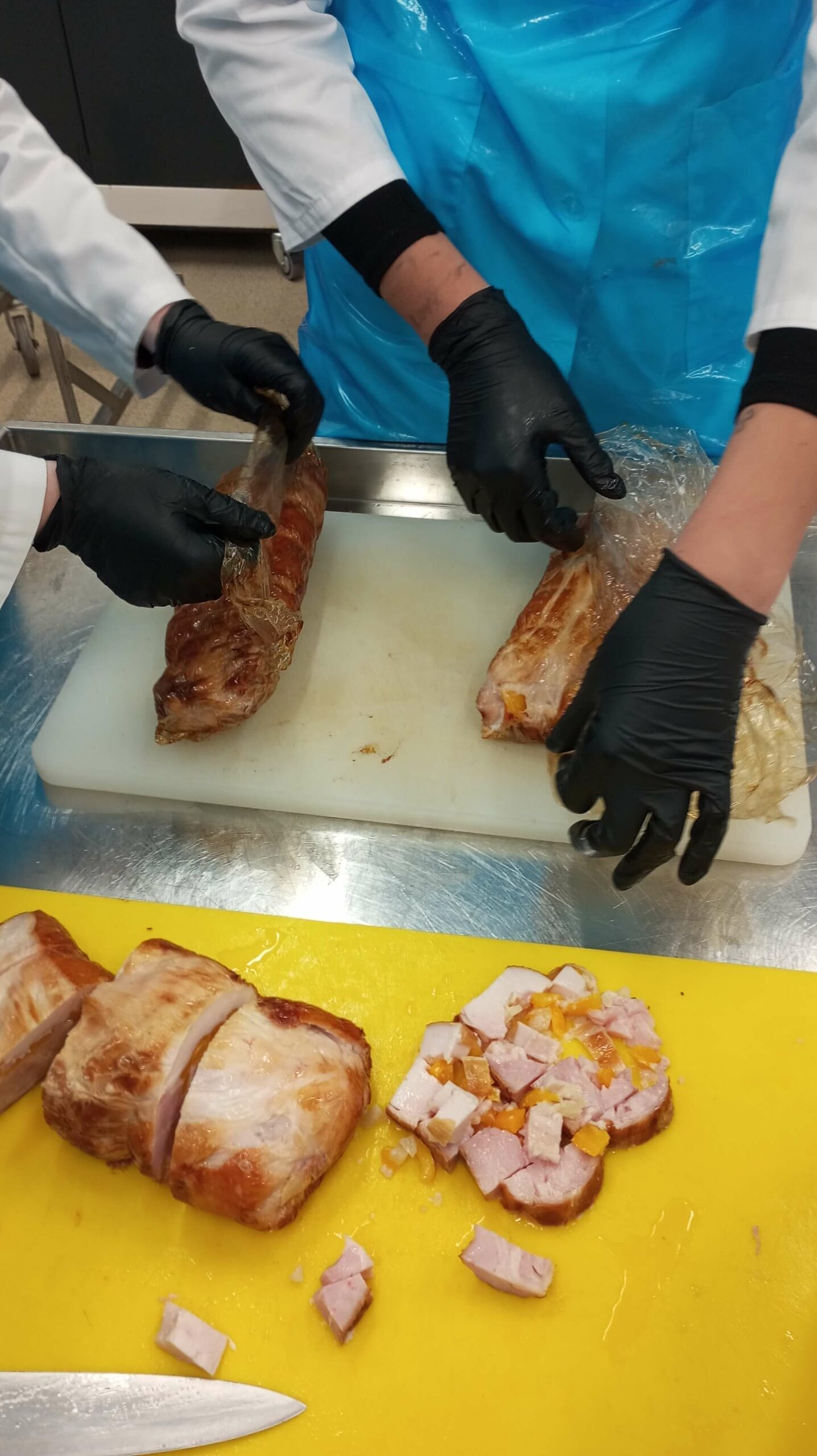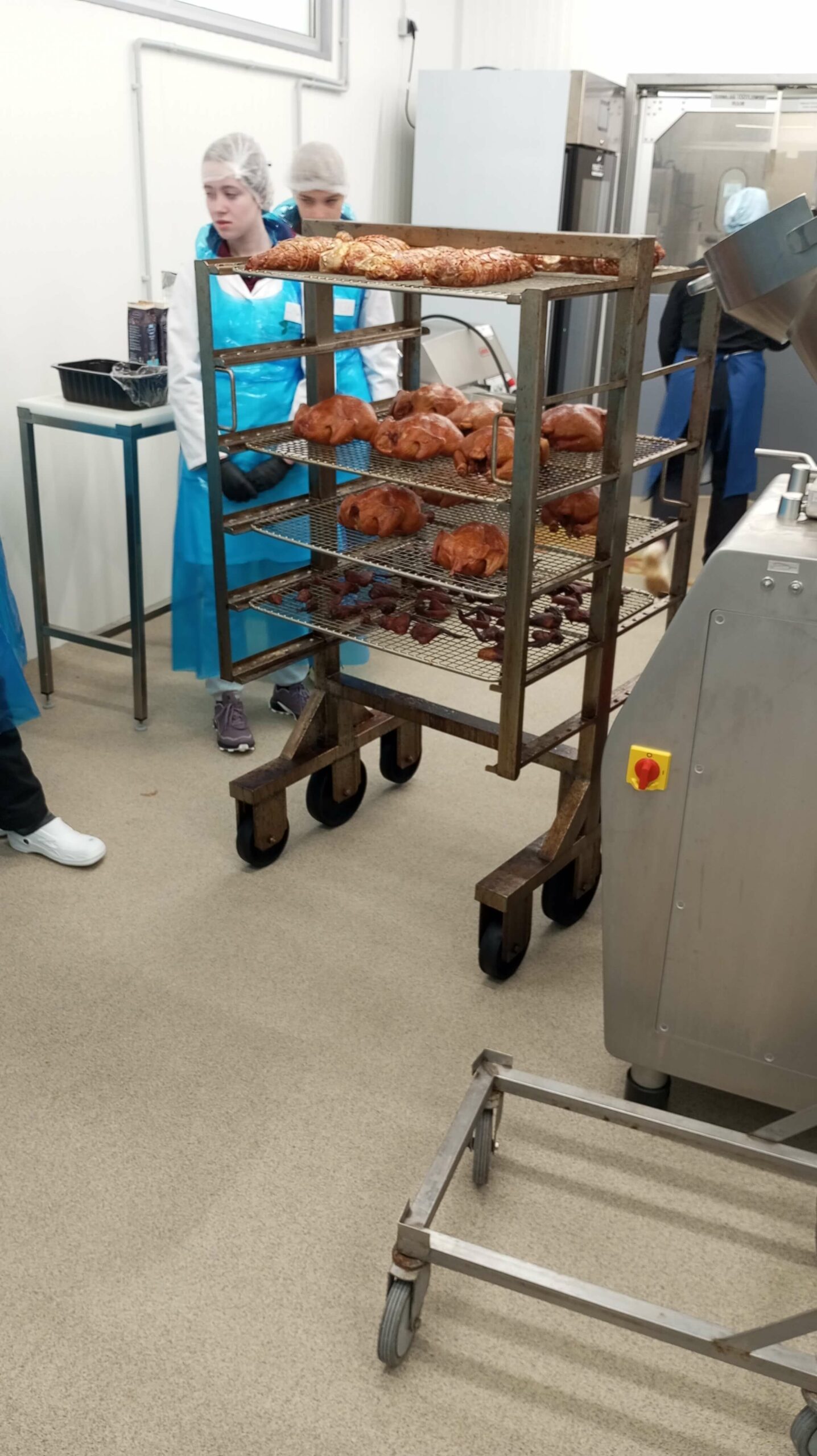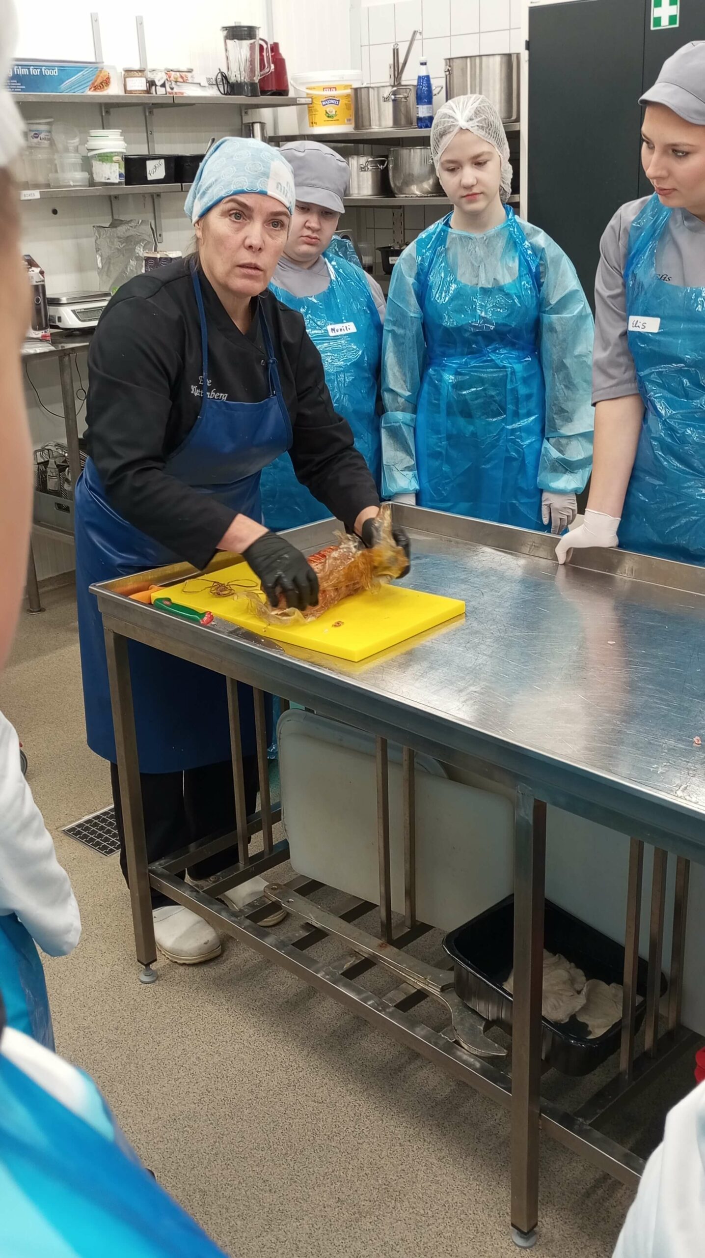 Mentorica Eva nam je najprej pokazala postopek razreza kratke prašičje noge in odstranitev kosti iz rame ter hrbtenice. Ko so bile vse kosti odstranjene, smo se lotile še kože. Pri delu smo morale biti natančne, potrpežljive in uporabljati res dobro nabrušene nože. Po dveh urah intenzivnega dela je sledil kratek odmor, nato pa smo nadaljevale v nekoliko hladnejši sobi z nedokončanim kosom svinjskega mesa. Nadaljevale smo z rezanjem kosa slanine in ločevanjem mesa od kosti. Odlično smo se odrezale in meso v celoti ločile. Ko je napočil čas kosila, smo hitro in temeljito očistile delavnico ter se odpravile v jedilnico. Vrsta za kosilo nas je spomnila na našo šolo BC Naklo – kolona ljudi se je vila vse do vhoda v stavbo. K sreči je šlo hitro, medtem pa smo se odločile za današnji meni: naravni zrezek s prilogami in sladico.