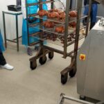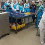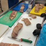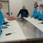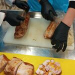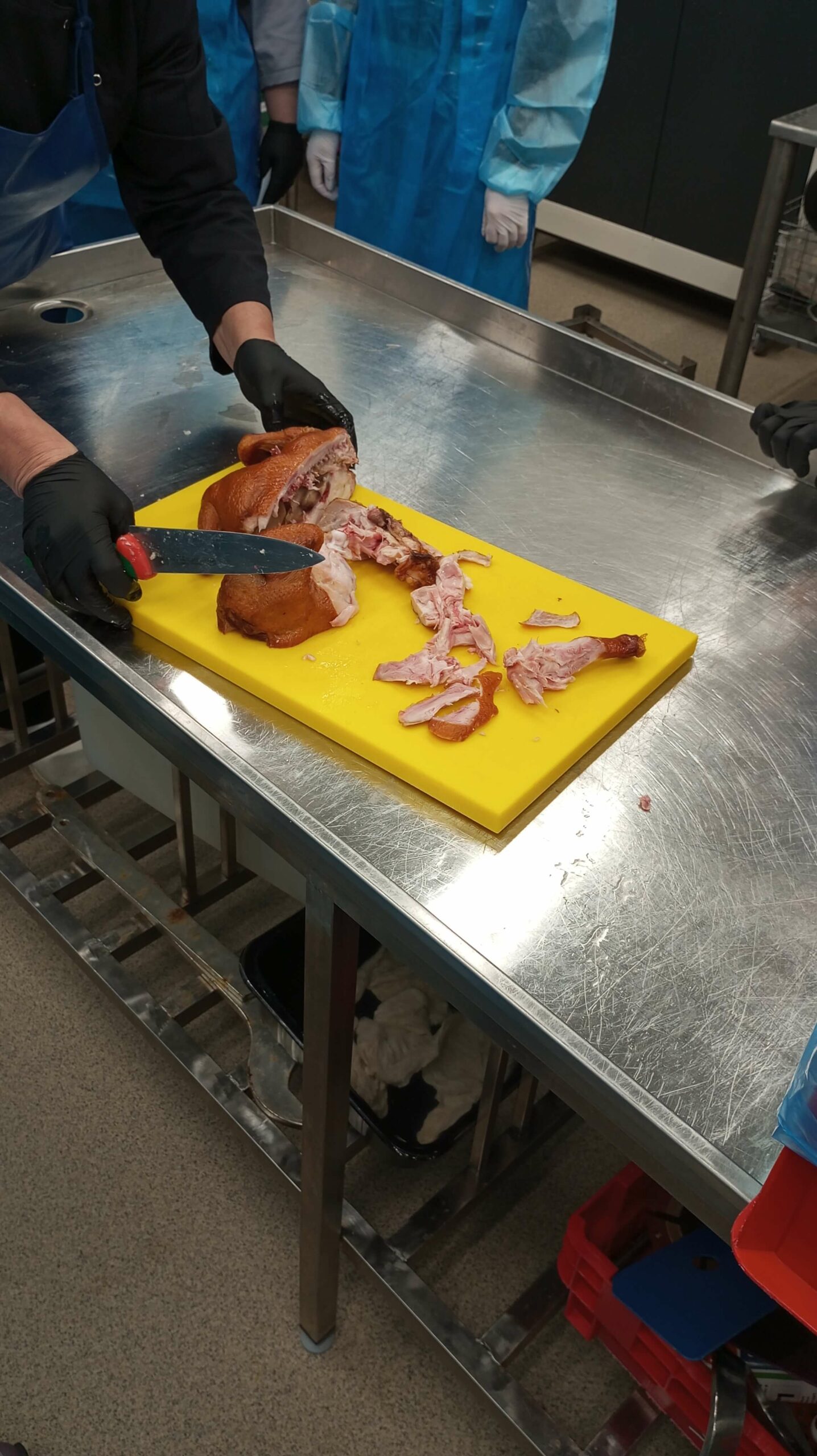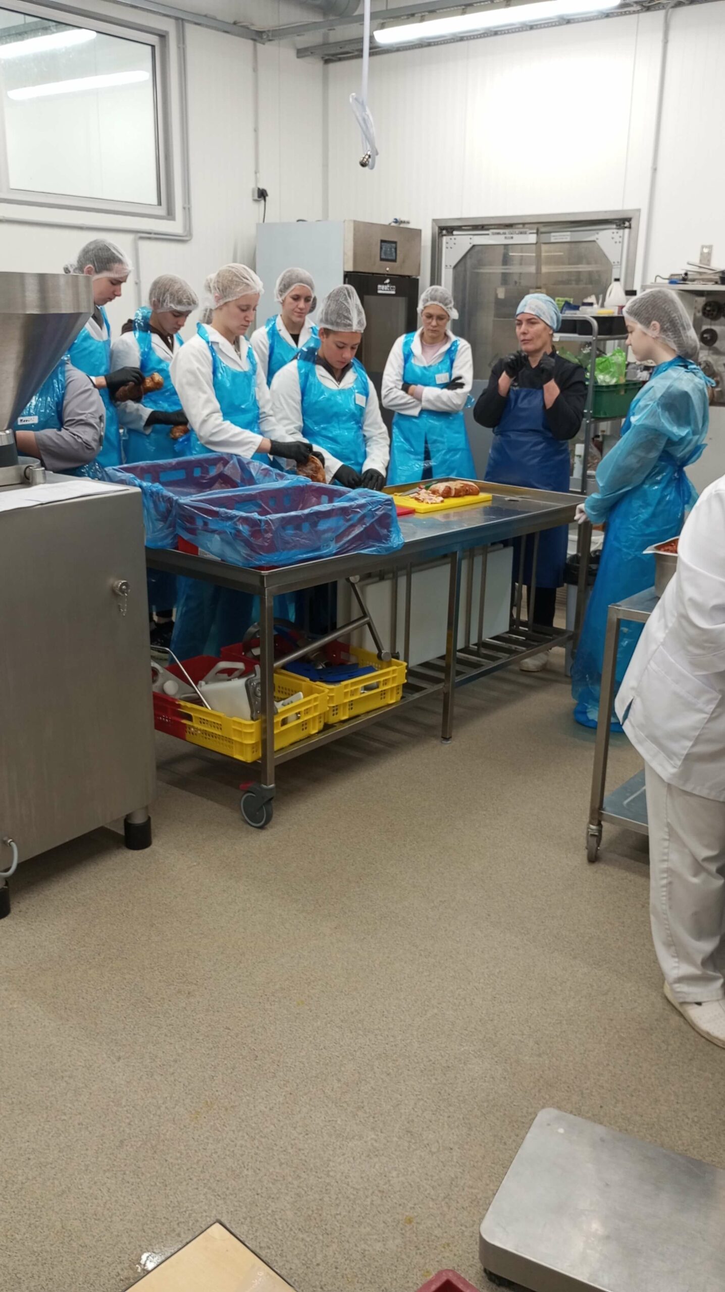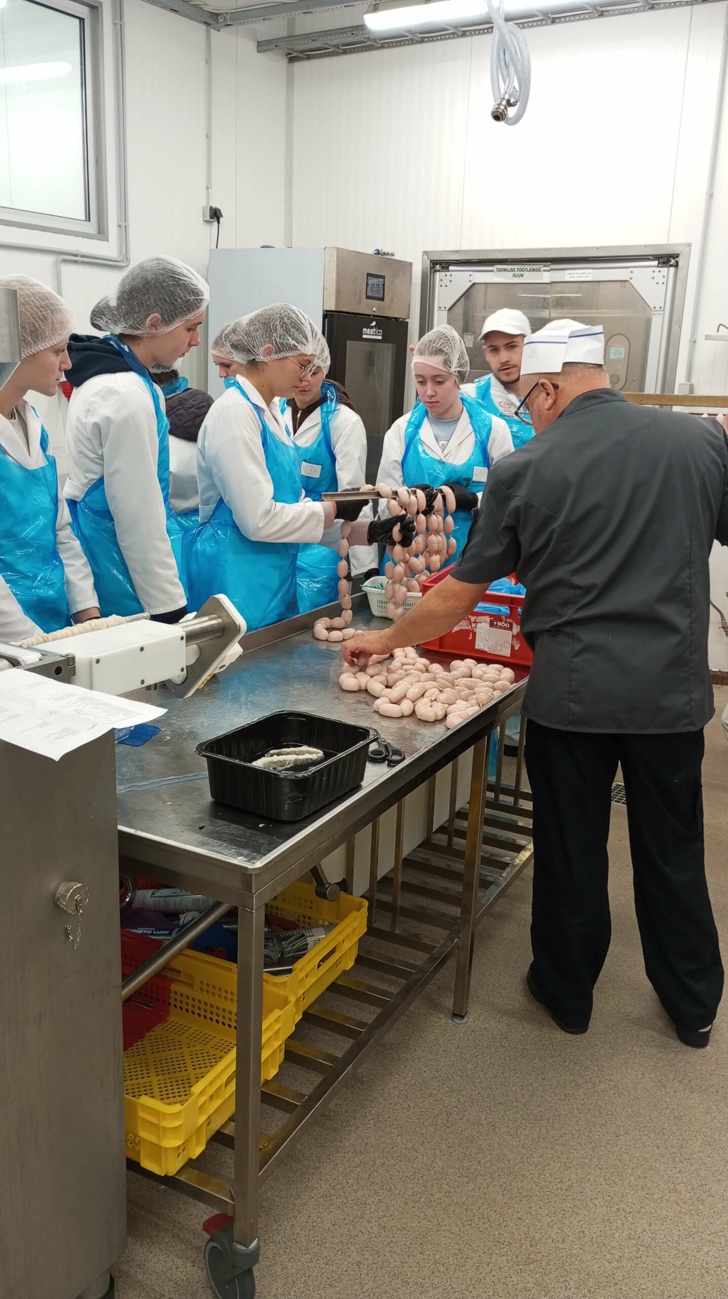 Mentorica Eva nam je najprej pokazala postopek razreza kratke prašičje noge in odstranitev kosti iz rame ter hrbtenice. Ko so bile vse kosti odstranjene, smo se lotile še kože. Pri delu smo morale biti natančne, potrpežljive in uporabljati res dobro nabrušene nože. Po dveh urah intenzivnega dela je sledil kratek odmor, nato pa smo nadaljevale v nekoliko hladnejši sobi z nedokončanim kosom svinjskega mesa. Nadaljevale smo z rezanjem kosa slanine in ločevanjem mesa od kosti. Odlično smo se odrezale in meso v celoti ločile. Ko je napočil čas kosila, smo hitro in temeljito očistile delavnico ter se odpravile v jedilnico. Vrsta za kosilo nas je spomnila na našo šolo BC Naklo – kolona ljudi se je vila vse do vhoda v stavbo. K sreči je šlo hitro, medtem pa smo se odločile za današnji meni: naravni zrezek s prilogami in sladico.