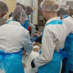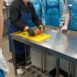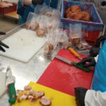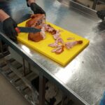 Uvodni del je bil namenjen higieni, ki je pri delu z mesom še posebej pomembna. Oblekle smo zaščitne predpasnike in čepice, si temeljito umile roke ter jih zaščitile z rokavicami. Tema delavnice je bila razrez celega piščanca na posamezne dele (krila, noge, prsi) ter priprava novih izdelkov iz teh kosov. Mentorica Eva nam je zaupala, da lahko uporabimo prav vse dele piščanca, če smo le dovolj ustvarjalne in pogumne kuharice.
