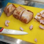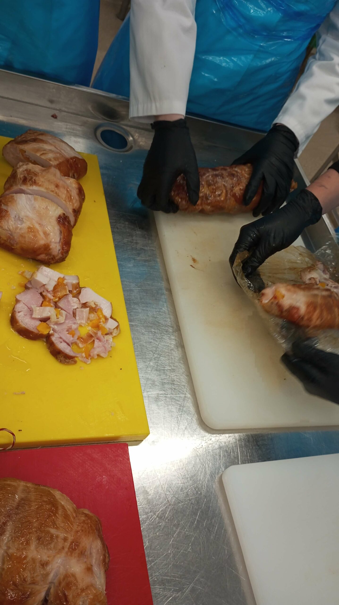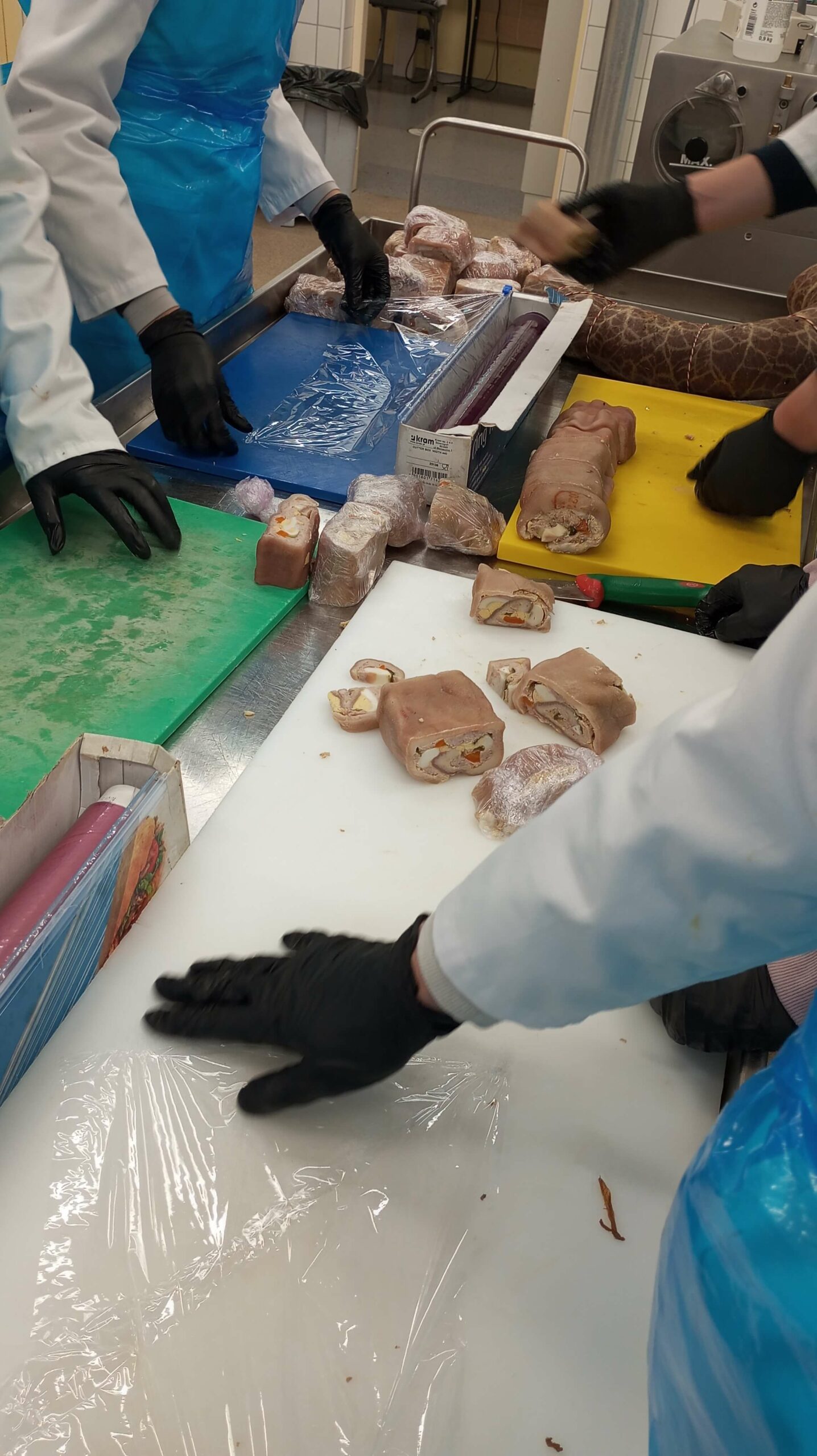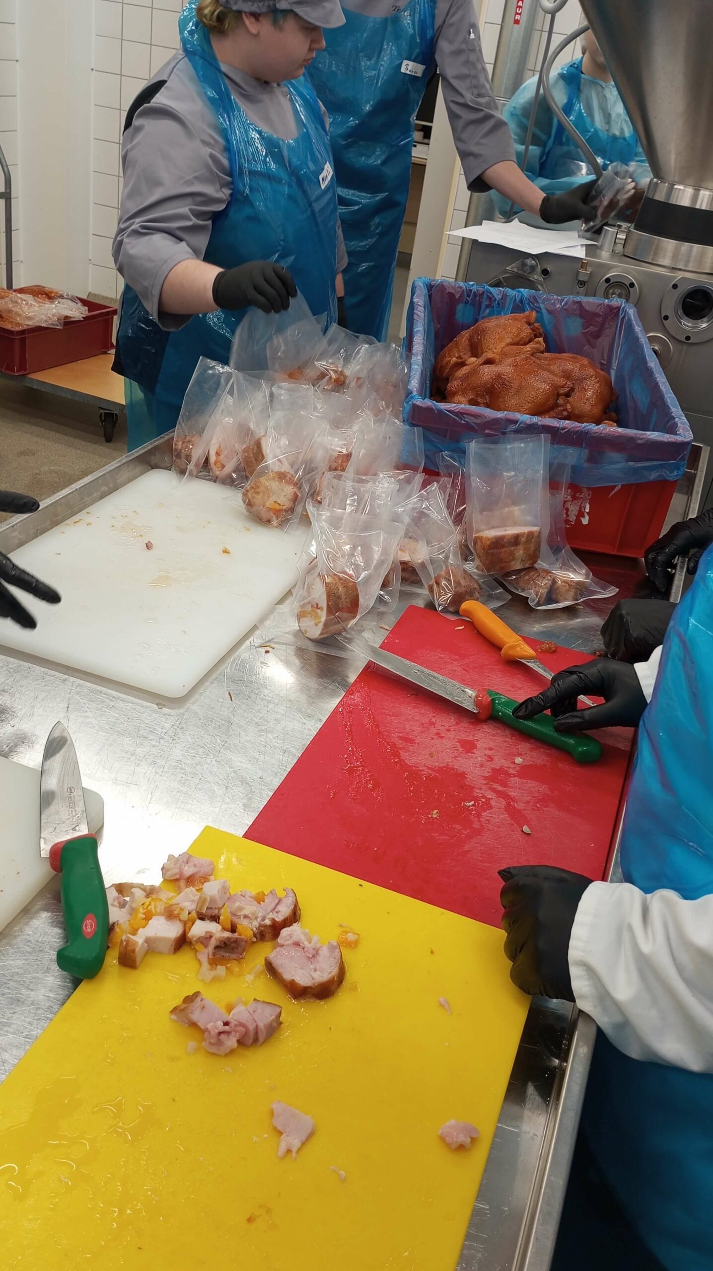 Hop iz kombija v garderobo, kjer smo se preoblekle in odvihrale v mesarsko delavnico. Tam nas je, kot vsako jutro, prijazno pozdravila mentorica Eva. Čakal nas je še zadnji dan delavnice, ki je vedno prinesla nekaj okusnega, drugačnega – in, kot se za prave kulinarične ustvarjalke spodobi, smo vse tudi poizkusile. Tokrat smo pripravljale rolado iz prašičje kože in očiščenega piščanca.