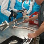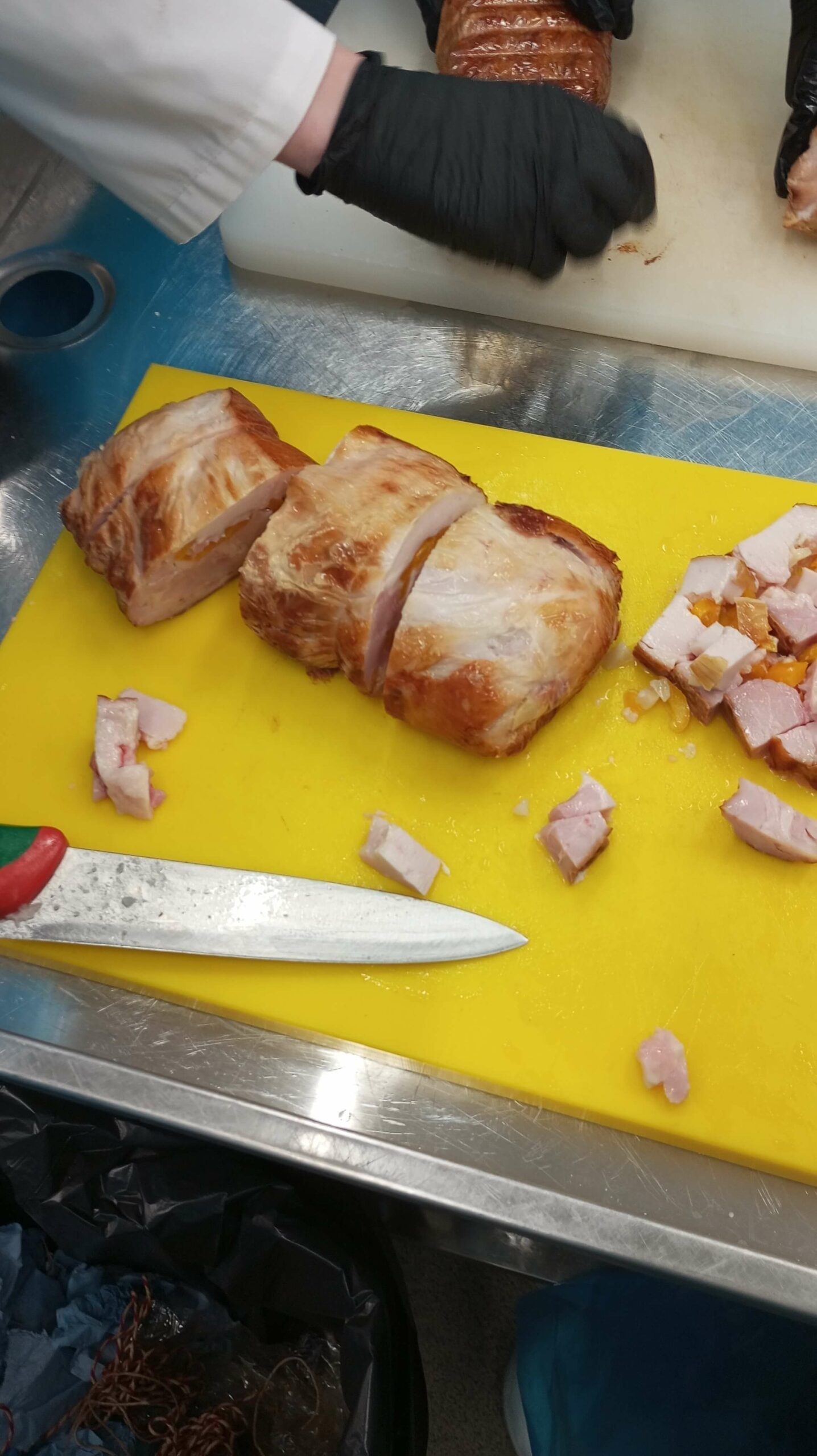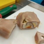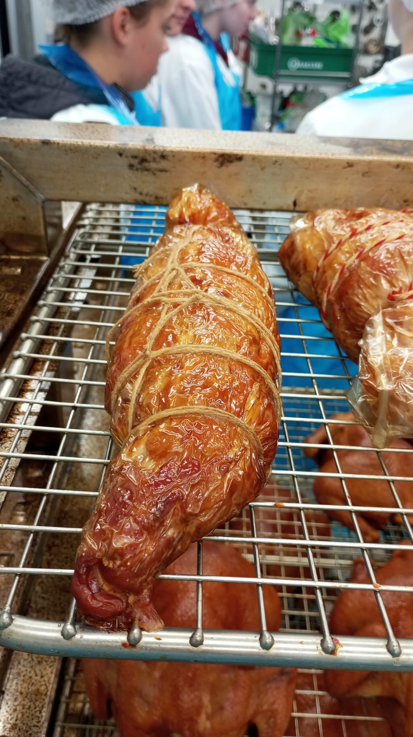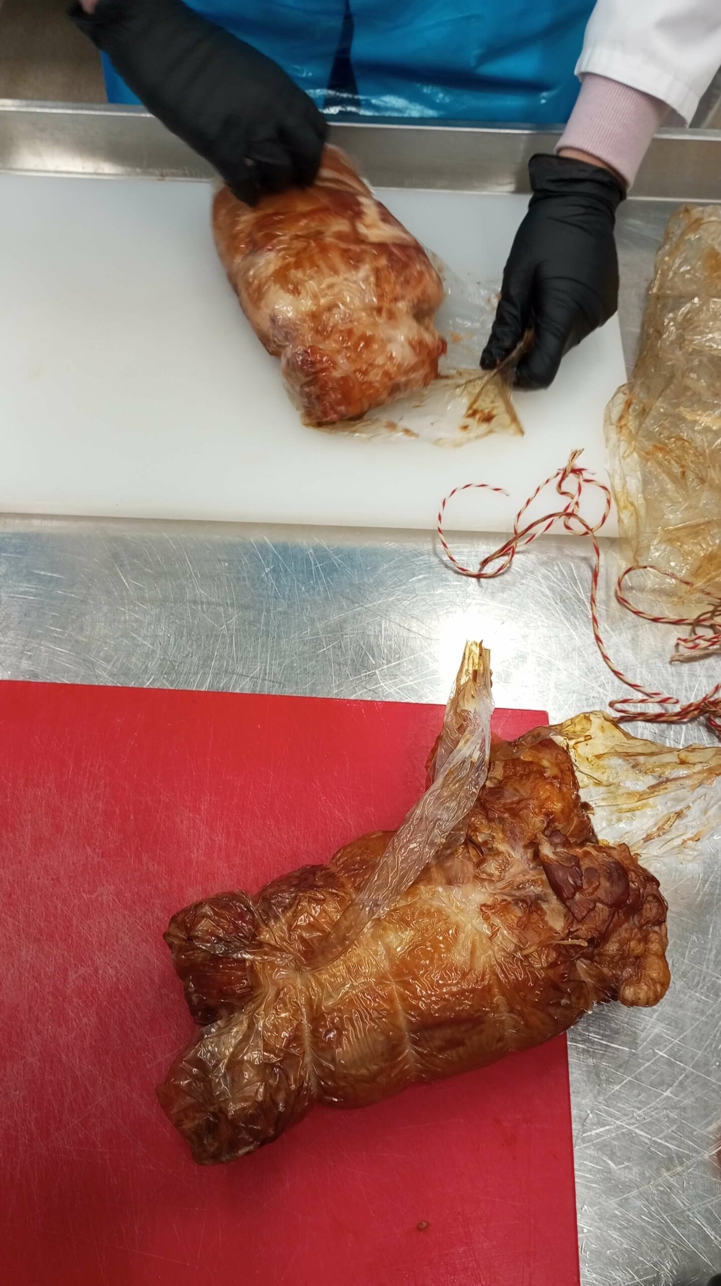Hop iz kombija v garderobo, kjer smo se preoblekle in odvihrale v mesarsko delavnico. Tam nas je, kot vsako jutro, prijazno pozdravila mentorica Eva. Čakal nas je še zadnji dan delavnice, ki je vedno prinesla nekaj okusnega, drugačnega – in, kot se za prave kulinarične ustvarjalke spodobi, smo vse tudi poizkusile. Tokrat smo pripravljale rolado iz prašičje kože in očiščenega piščanca.