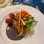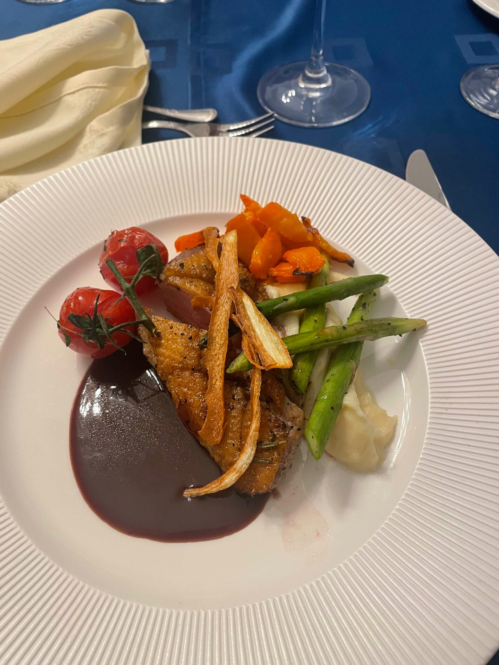 V grajski dvorani nas je pričakala lepo pripravljena miza z elegantnimi pogrinjki in brezalkoholnim aperitivom. Sledila je razkošna večerja: kremna gobova juha, steak iz račjega fileja, pire krompir, popečen paradižnik, šparglji in za zaključek še čudovita pavlova torta. Slavnostno večerjo so pripravili dijaki šole gostiteljice s svojo mentorico. Vsi smo priznali, da smo se počutili kot pravi plemiči in plemkinje.
