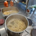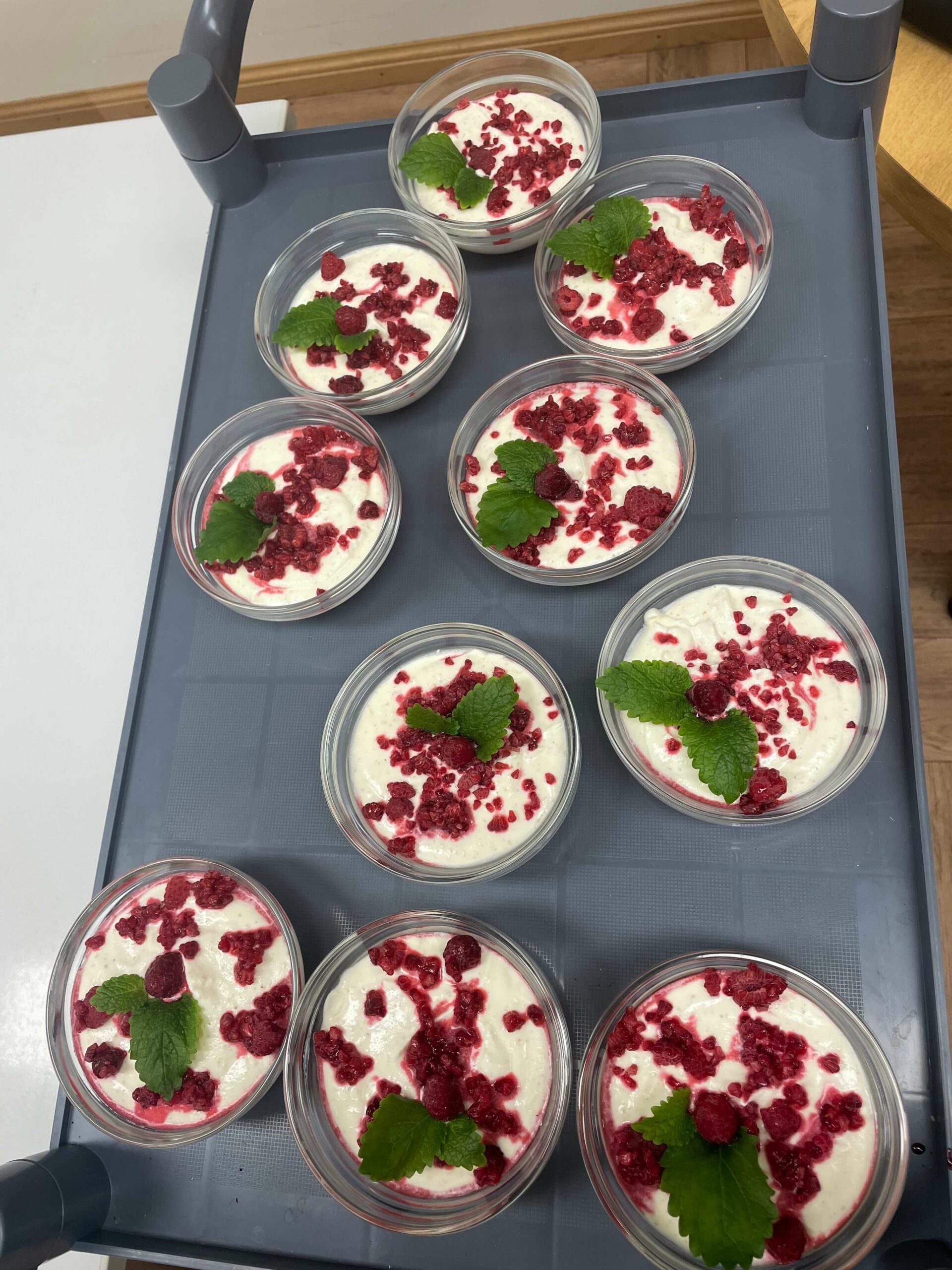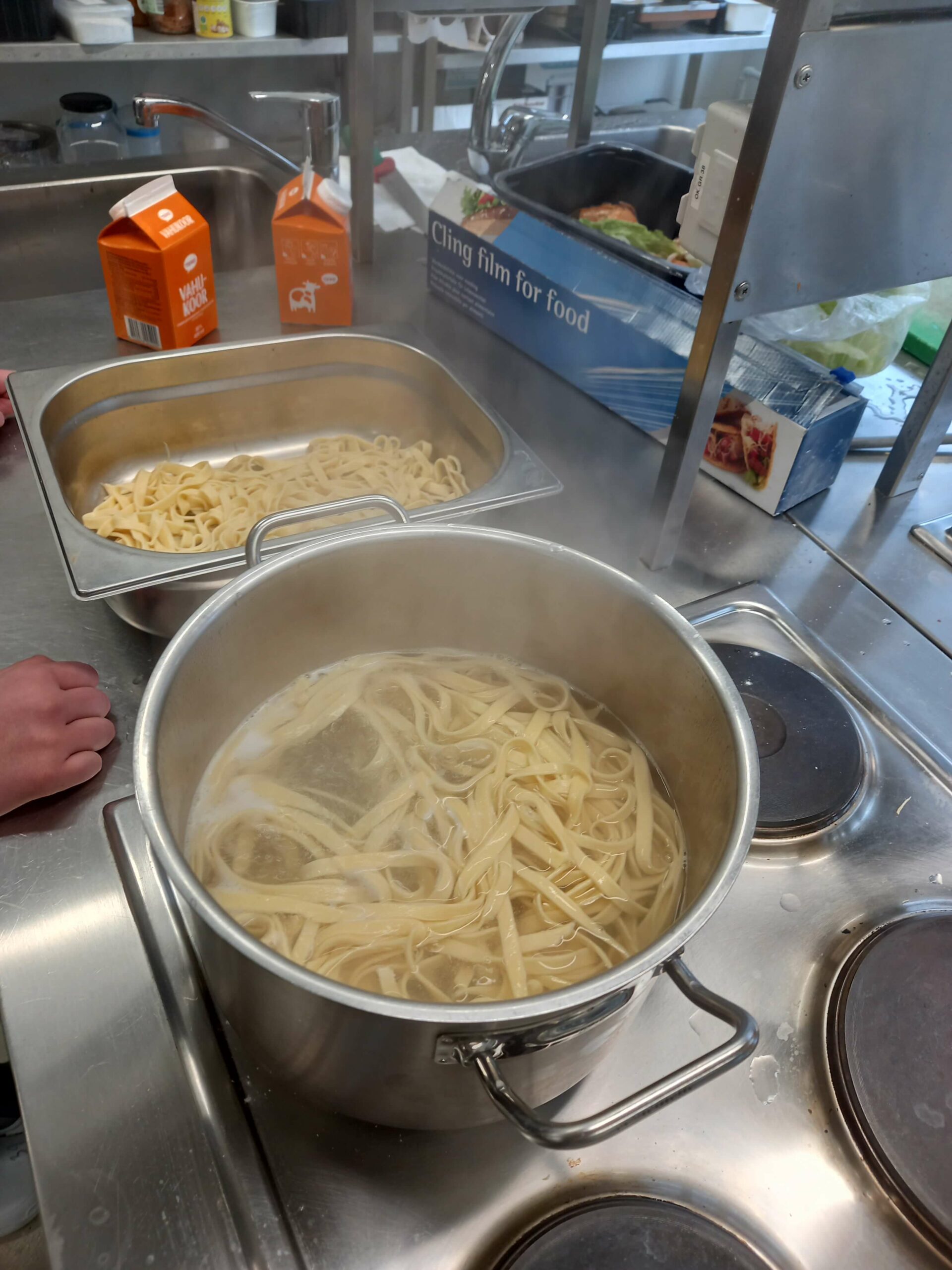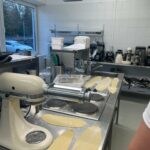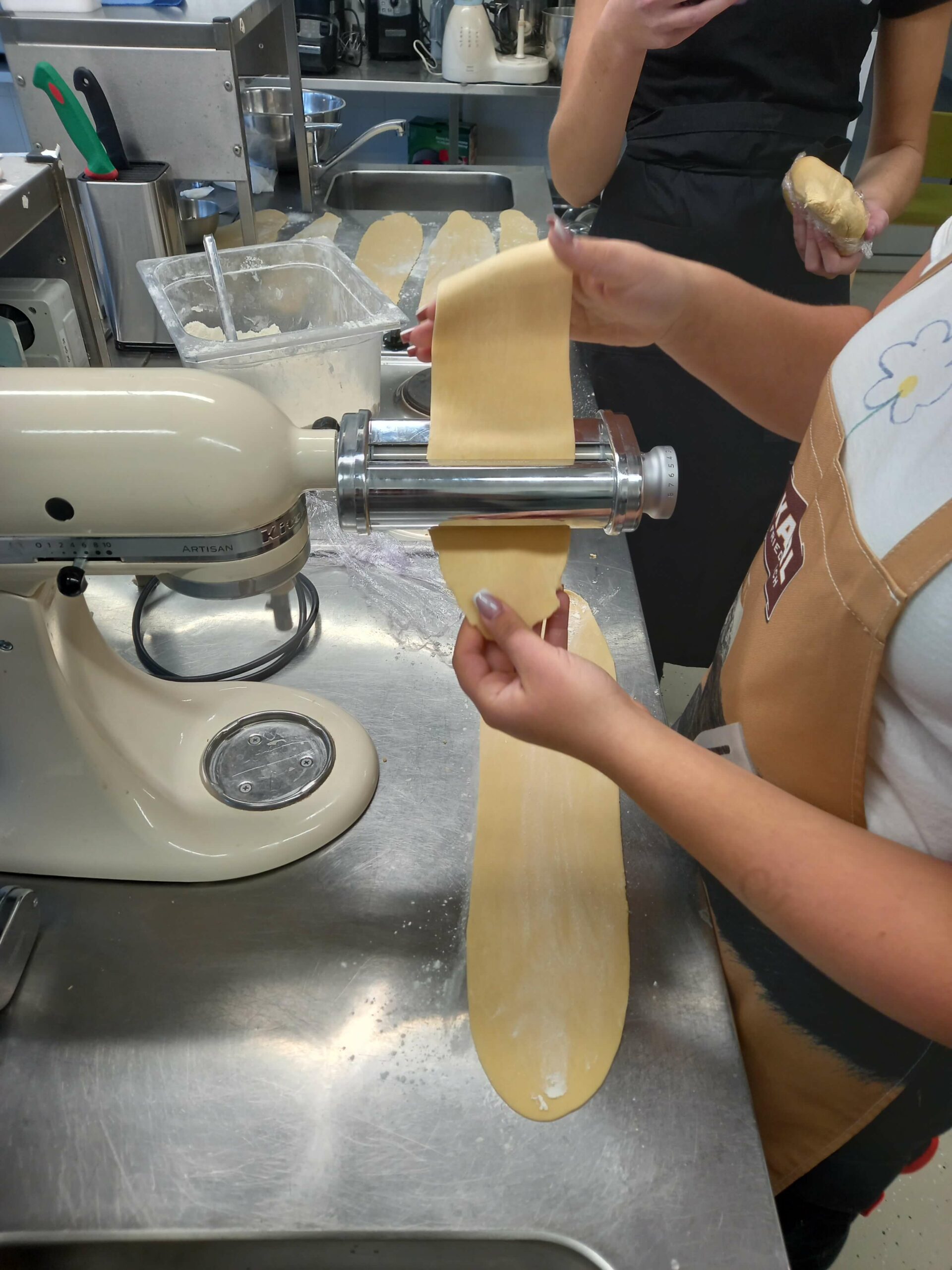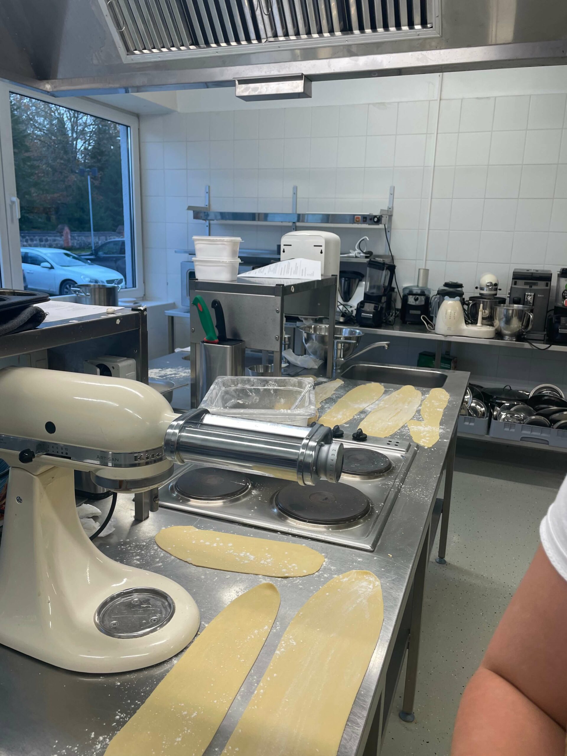 Zjutraj smo pozajtrkovali in se odpravili v šolo. V kuhinji nas je pričakala profesorica Kaiti. Nato smo se lotili dela – pripravili smo domače testenine s piščancem, kremo z maslom, fokačo in za konec še sladico z malinami in kremo.