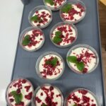 Naša prva naloga je bila dokončati jogurt. Navadnemu jogurtu smo dodale marmelado iz kivija in kosmulje. Ko smo bile zadovoljne z okusom, so ga Manca, Lucija, Maja in Anja spakirale v plastične lončke za prodajo.