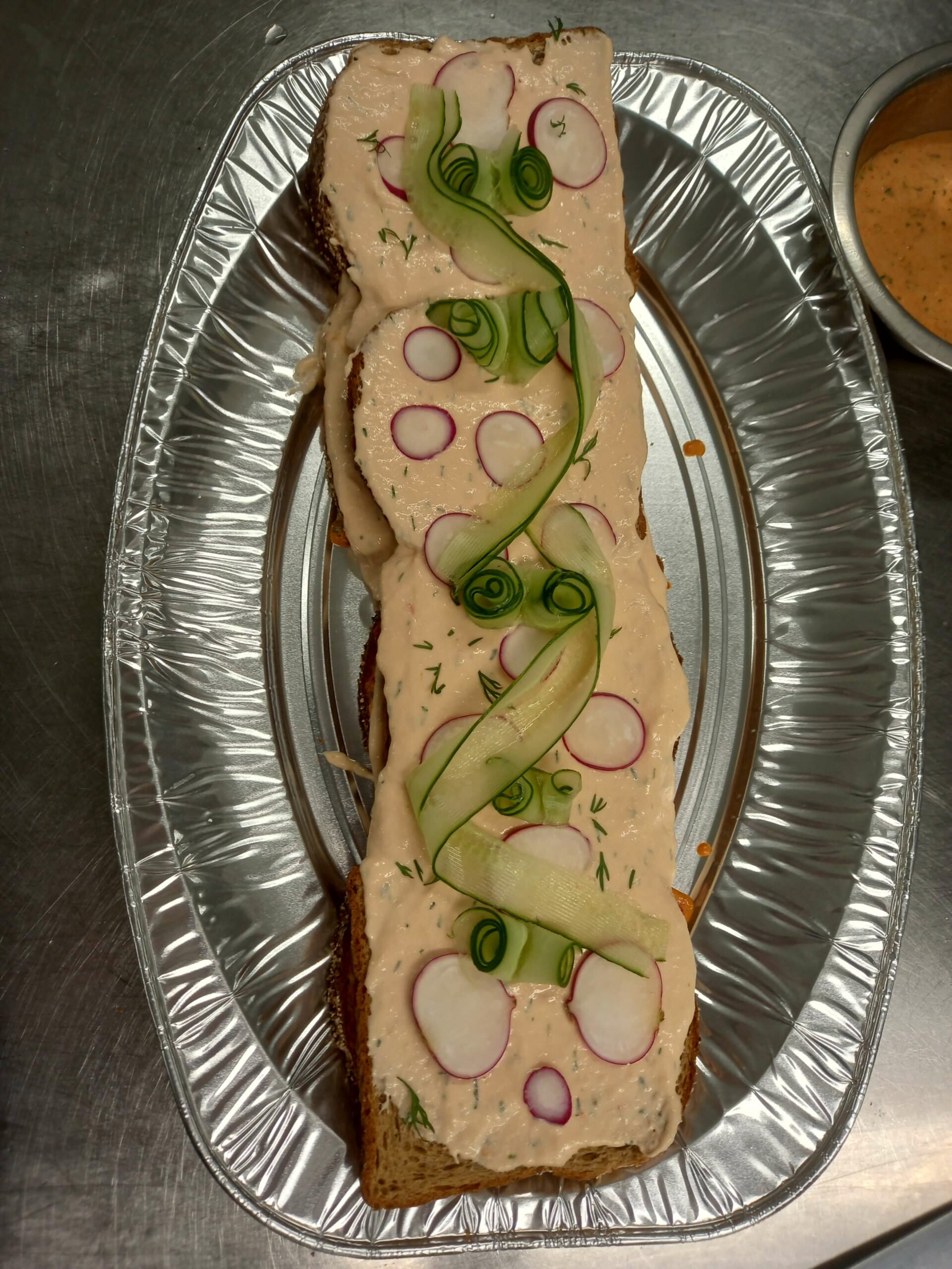 Ko smo končali, smo za sabo počistili. Ker je do prihoda avtobusa ostalo še nekaj časa, smo pripravili še torto iz kruha. Vsak je naredil svoj namaz po okusu in torto okrasil. Pri tem nam je pomagal ukrajinski dijak po imenu Daniel.