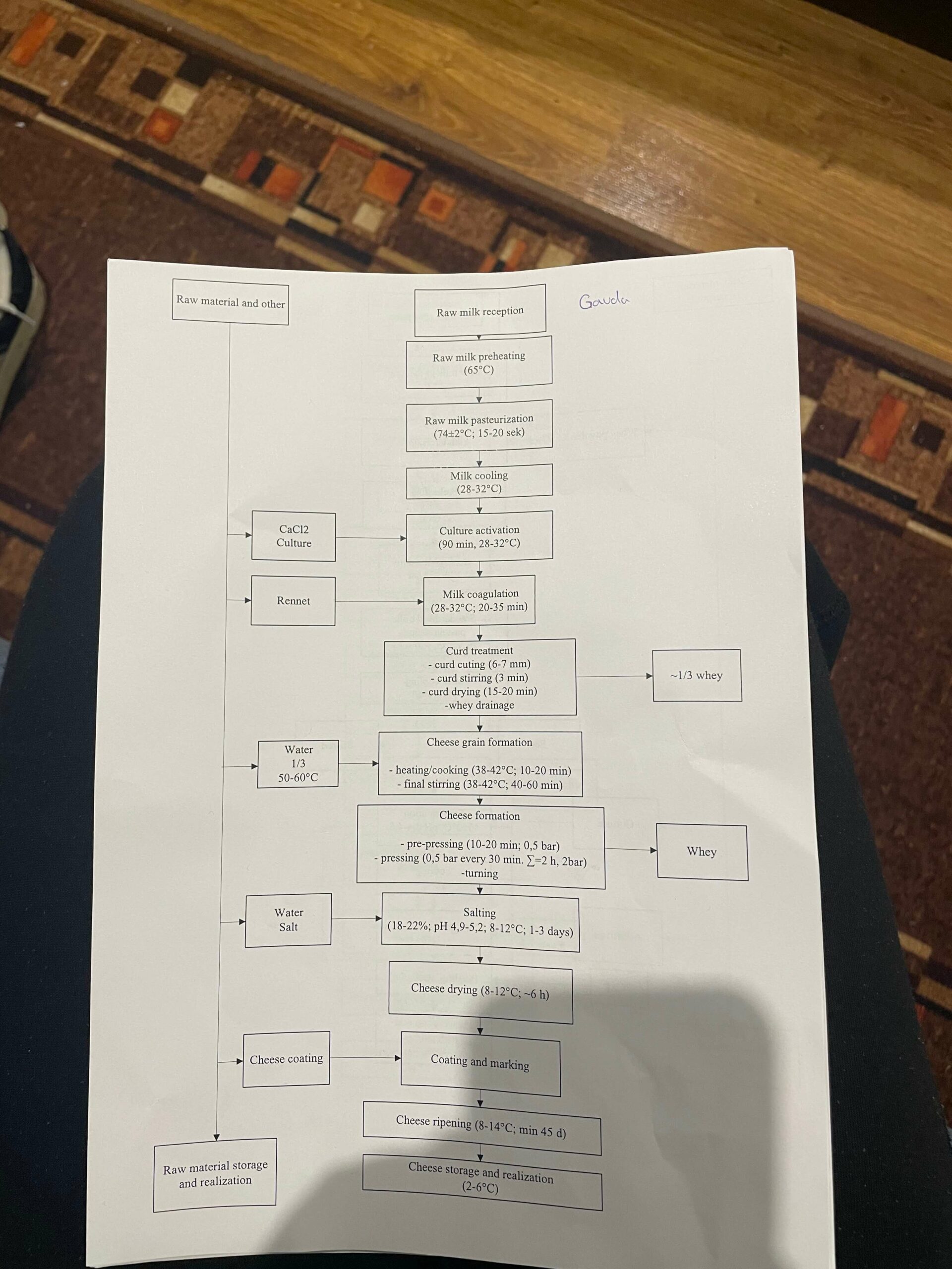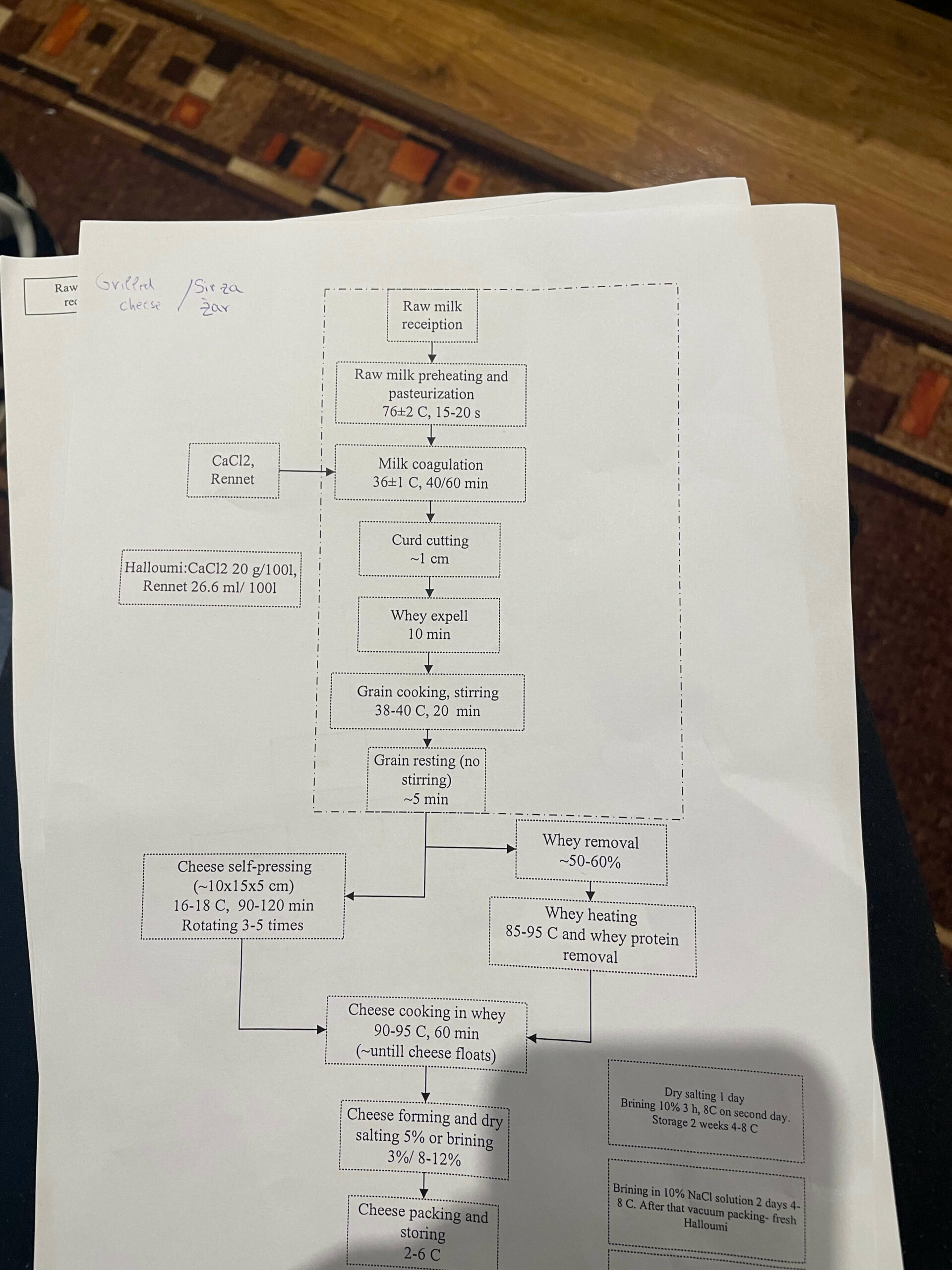 Danes smo izdelovale tudi sir na žaru. Najprej smo na štedilniku segrele mleko in mu dodale dodatek, da se je zgostilo. Ko se je zmes zgostila, smo jo narezale na majhne koščke in kuhale še približno 20 minut. Tako smo dobile skuto in sirotko. Skuto smo nato dale v model in oblikovale sir. Sirotko smo segrele na 100 °C in vanjo položile sir za žar, ki smo ga prej razrezale na šest delov. Sir smo kuhale približno eno uro, nato pa ga postavile v slano vodo, kjer bo ostal čez noč.