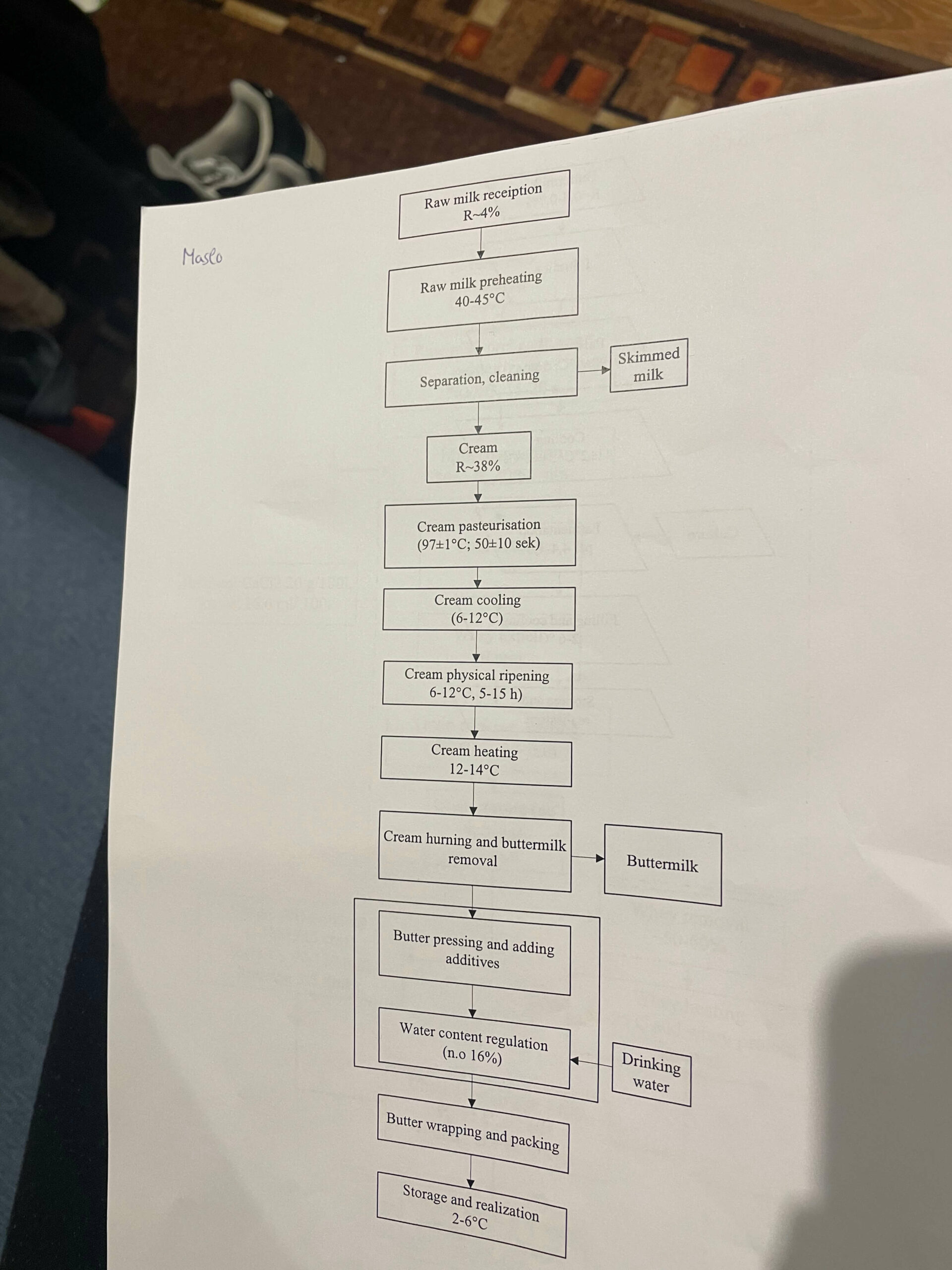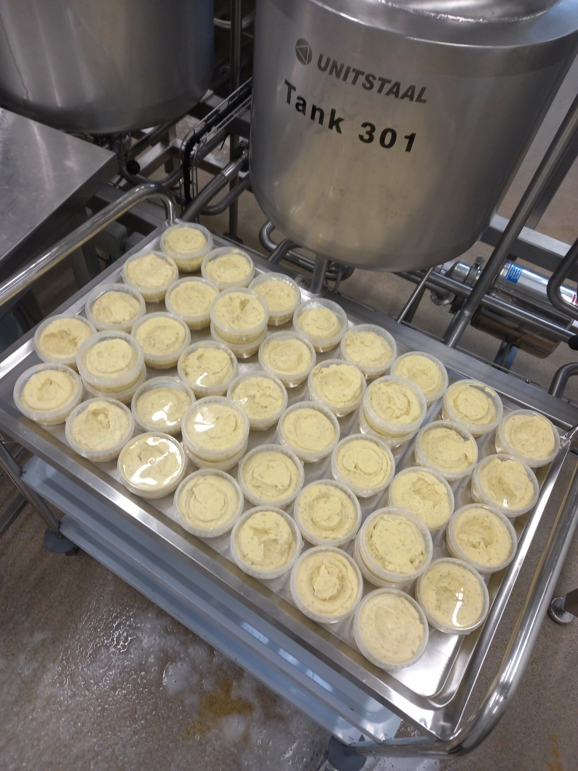 Naša zadnja naloga je bila izdelava masla. Segrele smo 17 litrov smetane na 14 °C in jo prelile v stroj za izdelavo masla. Stroj je smetano mešal 15 minut. Po mešanju smo dobile maslo in tekočino. Tekočino smo odlile, segrele na 30 °C in jo postavile v inkubator. Maslo smo dobro oprale z vodo, nato pa ga preizkusile – bilo je zelo okusno. Dodale smo mu še začimbe in česen ter ga spakirale v plastične lončke.