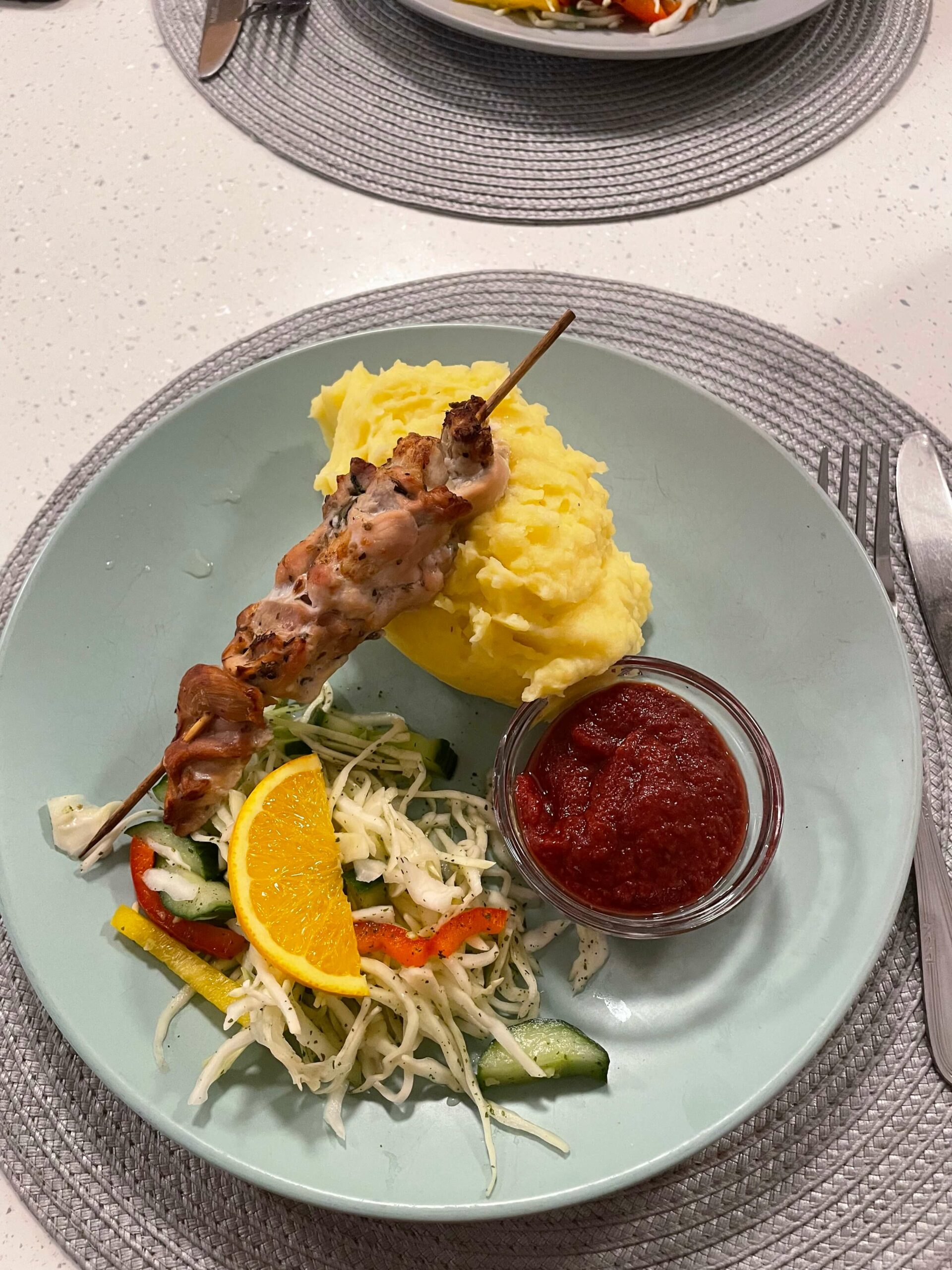 Dan se je prehitro končal. Ob mraku smo se vrnili v naše bivališče, kjer nas je pričakala dišeča večerja – pečenka s pire krompirjem in kislim zeljem, za sladico pa sadje ali sadna pita. Njami!