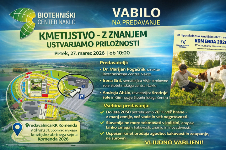 VABILO NA PREDAVANJE Biotehniški center Naklo vas v okviru 31. Spomladanskega kmetijsko-obrtnega sejma Komenda 2026 vljudno vabi na strokovno predavanje z naslovom: KMETIJSTVO – Z ZNANJEM USTVARJAMO PRILOŽNOSTI 📅 Petek, 27. marec 2026 🕙 ob 10.00 📍 Predavalnica KK Komenda (lokacija