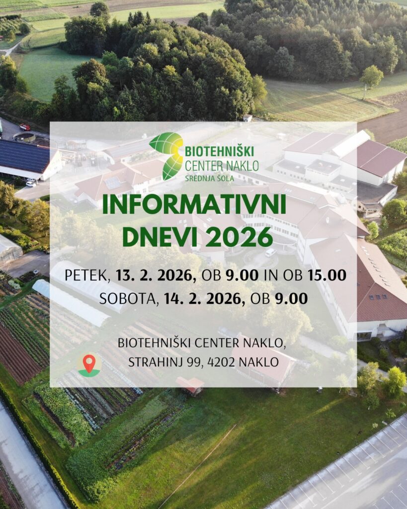 POVABILO INFORMATIVNI DNEVI 2026 Lepo povabljeni, da se nam pridružite na INFORMATIVNIH DNEVIH, 13 in 14. februarja 2026 na BC Naklo. Dijaki bodo skupaj z mentorji predstavili dejavnosti, učilnice, posestvo … vas popeljali skozi aktivnosti v življenje in delo na