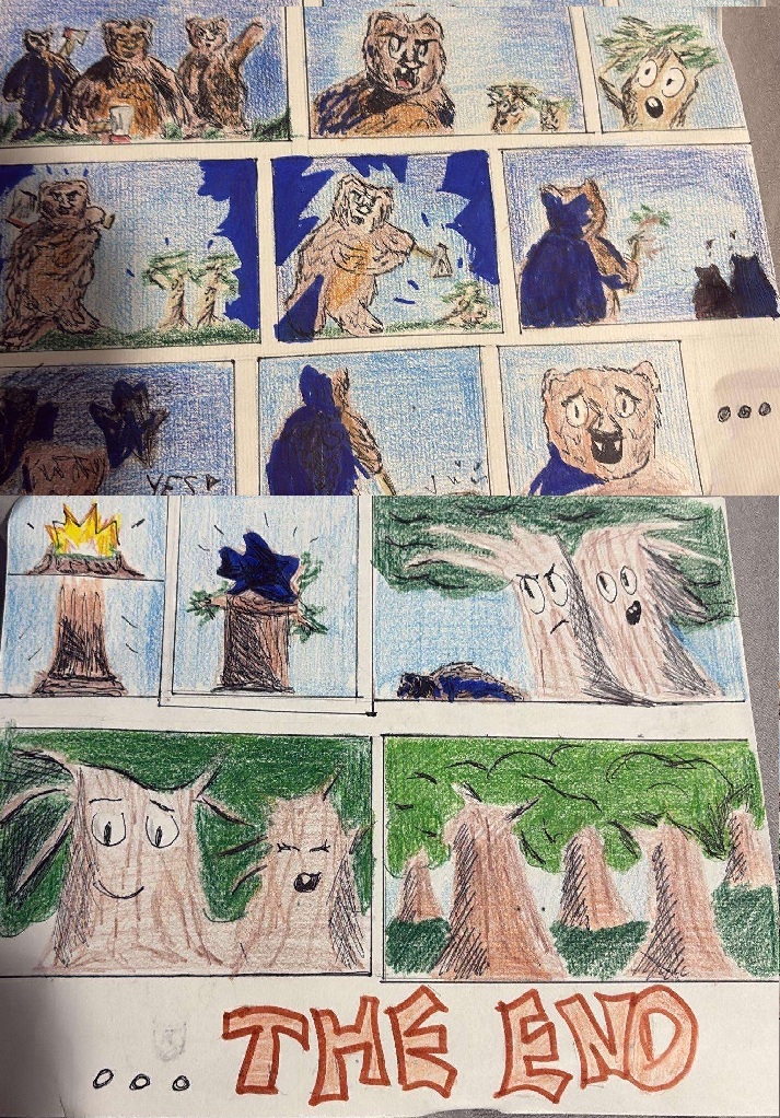 Naša druga naloga je bilo oblikovanje stripa, ki prikazuje rojstvo demokratične družbe. Mi smo ga izdelali v simbolni govorici. Medvedje prikazujejo diktatorje, drevesa pa mlade družbe, ki hočejo živeti varno življenje. Nekega dne se medvedje odločijo, da bodo napadli drevesa in jim celo uspe jih nekaj posekati. Ampak drevesa se naučijo, kako premagati medvede in se žrtvujejo tako, da padejo na medvede in porušijo njihovo širjenje nasilja. Tato lahko mlajša drevesa živijo lepo in mirno življenje.«