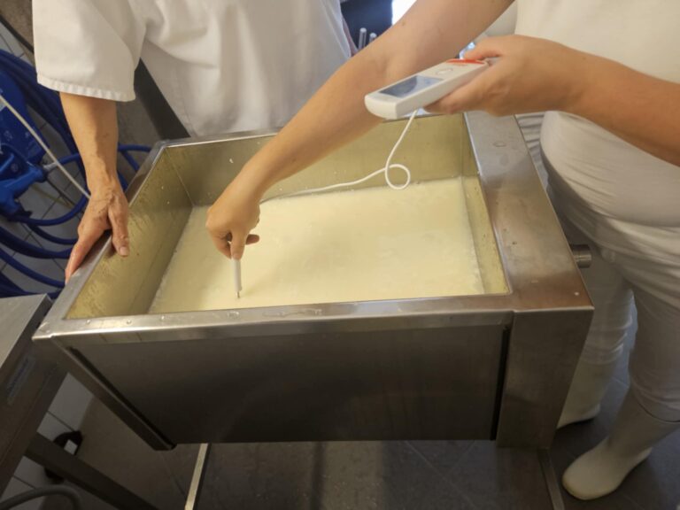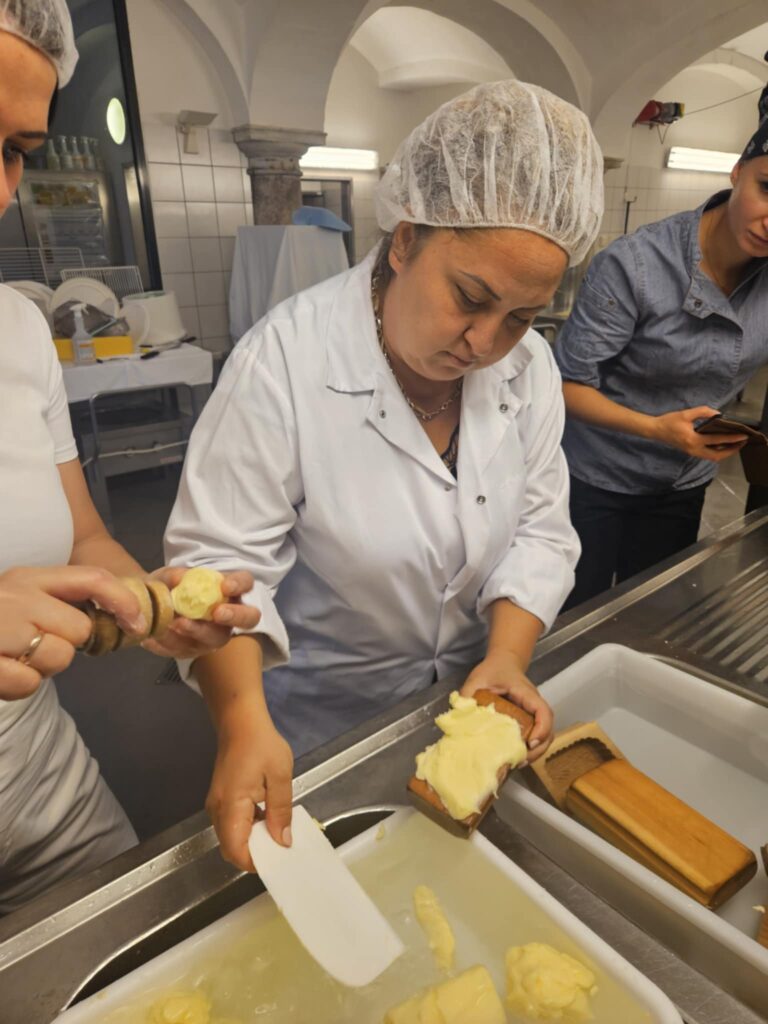 V sredo, 11. 9. 2025, smo delo nadaljevali z izdelavo poltrdega sira in sira kamamber. Sami smo pripravili mleko, dodali potrebne dodatke glede na protokol. Spremljali smo pH vrednost in temperaturo mleka tekom procesa sirjenja. Sami smo razrezali koagulum in utrjevali sirno zrno. Popoldne smo obiskali lokalno sirarno Kaslabn Nockberge, kjer smo spoznali kako lokalni kmetje pridelujejo različne tipe sir iz lokalnega senenega kravjega mleka in kozjega mleka. Po končanem izdelku smo njihove sire in maslo tudi degustirali.
