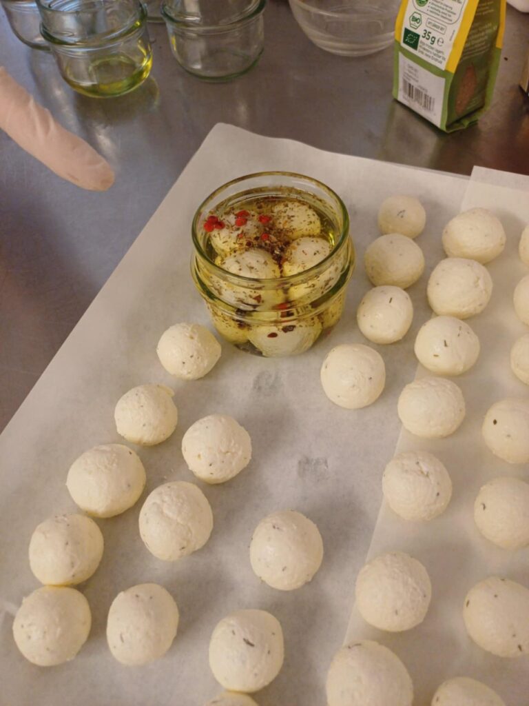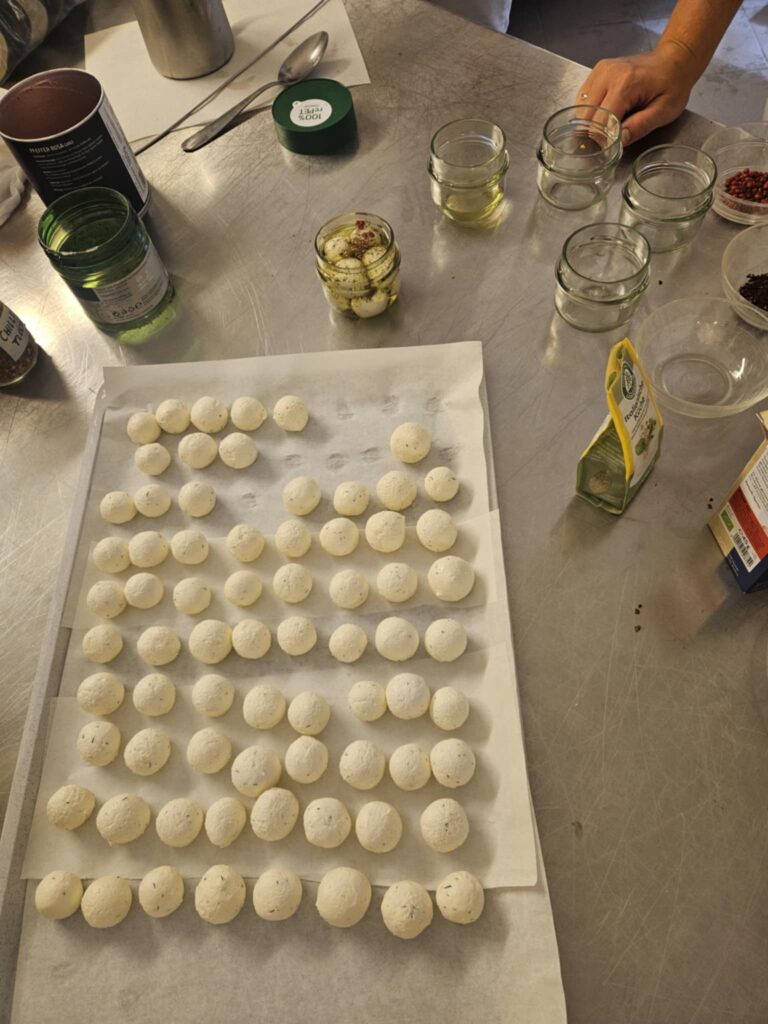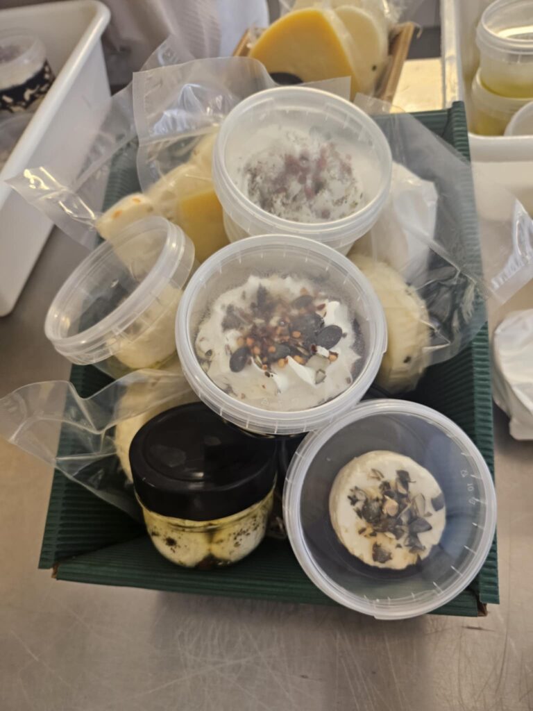 V četrtek, 12. 9. 2025, smo zjutraj obiskali lokalno tržnico kjer smo z lokalnimi sirarji in pridelovalci govorili o njihovih izzivih in prednostih, ki jih vidijo pri svojem delu. Kasneje smo delo nadaljevali v šolski mlekarski delavnici, kjer smo se spoznali z različnimi metodami soljenja sira in na kakšen način jih uporabljajo. Pripravili smo različne namaze iz skute in skutne kroglice v olju. Izdelke smo tudi pakirali. Po končanem delu smo z mentorico še enkrat pregledali vse recepture in delavne liste za narejene izdelke. Odgovorila je na vsa naša vprašanja.