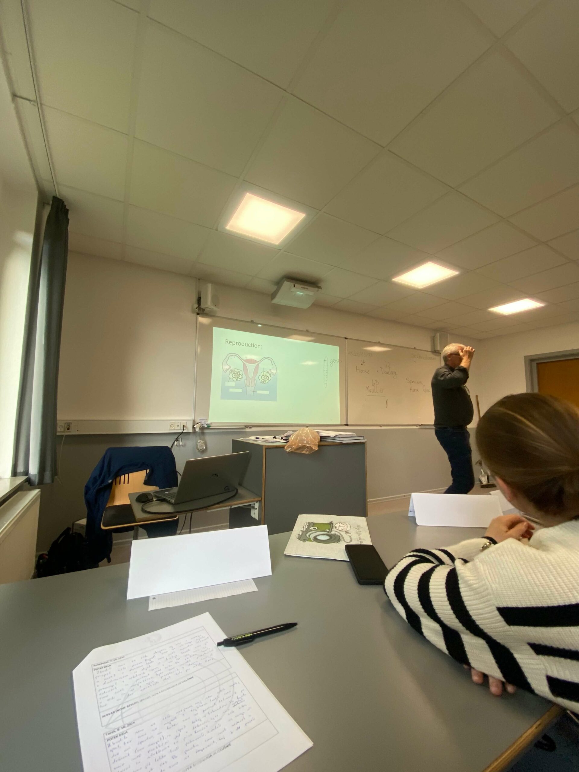 Začetek pouka biologije je bil namenjen našim predstavitvam, od kod smo in kaj že znamo na določeno izbrano temo iz biologije. Dokazali smo, da ni dobro le naše znanje biologije, ampak je vedno boljši tudi naš trenutni »sporazumevajoči se« angleški jezik. Po predstavitvah vseh dijakov torej nas iz Slovenije, Češke in Avstrije pa smo se skupaj z učiteljem spomnili in ponovili zgradbo cveta, zgradbo spolnih organov sesalcev s poudarkom pri kravah ter se vsi spomnili podobnosti in razlik z našimi, človeškimi, saj vsi spadamo med sesalce. Malo manj smo nekateri vedeli o genetiki, saj so le redki slišali kaj o genu oziroma kromosomu. Mi sedaj vemo več in bomo bolje pripravljeni pri predmetu biologije, ko bo vsebina govorila o genetiki, genih in kromosomih.